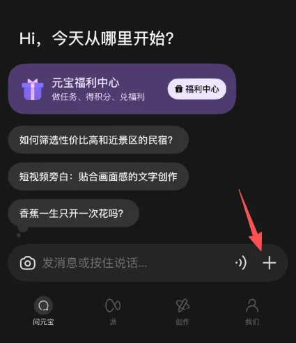 1、打开腾讯元宝,点击屏幕右下角消息区的“➕”按钮