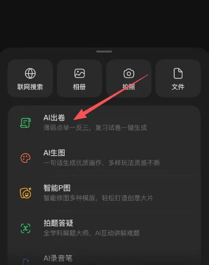 2、在选取的功能里选择“AI出卷”,如果没有可以向下滚动功能区选择。因为功能区是根据使用情况调整进行排列的。3、选择AI出卷后,有三大项可选,分别是:相似卷、答题巩固卷、自定义试卷。下面介绍一些具体的差别:- 相似卷:根据拍照上传的试卷生成一张考点、难度一样的新试卷,非常适合针对某种类型的试题反复练习;