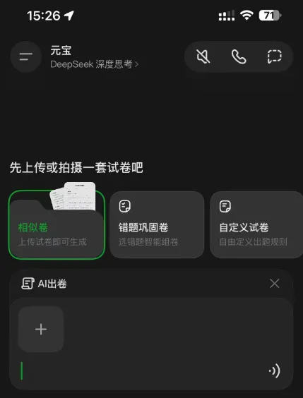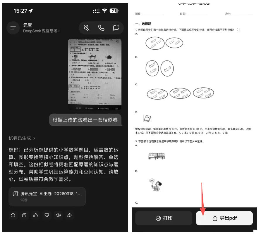 注意:相似卷和错题巩固卷都需要先按加号按钮拍试卷,拍好后再生成新试卷。根据参考卷生成的试卷可以直接打印或者导出PDF后再打印。经过AI的加持,生成试卷这块功能已经非常强大了。利用腾讯元宝提供的试卷生成功能让你无需购买其他App就能满足出题需求,感兴趣的家长去试试吧。