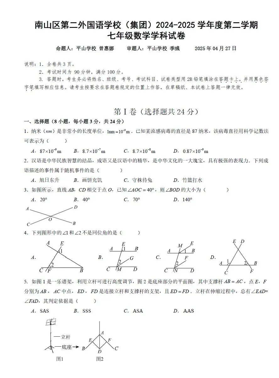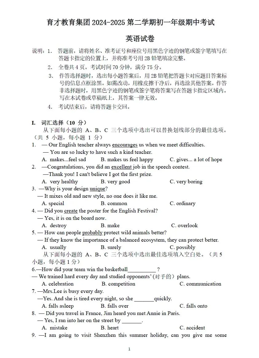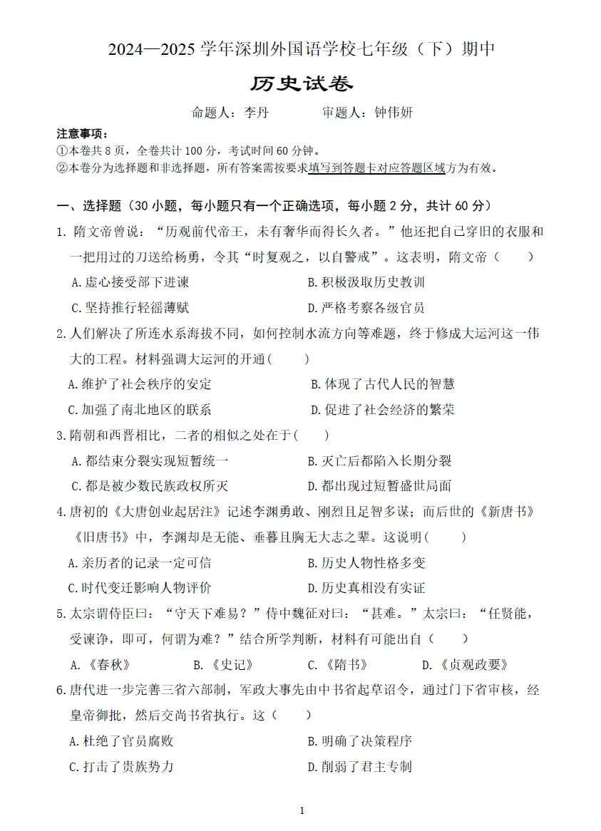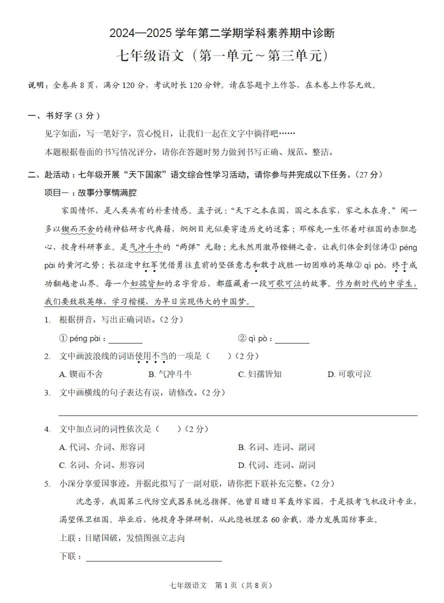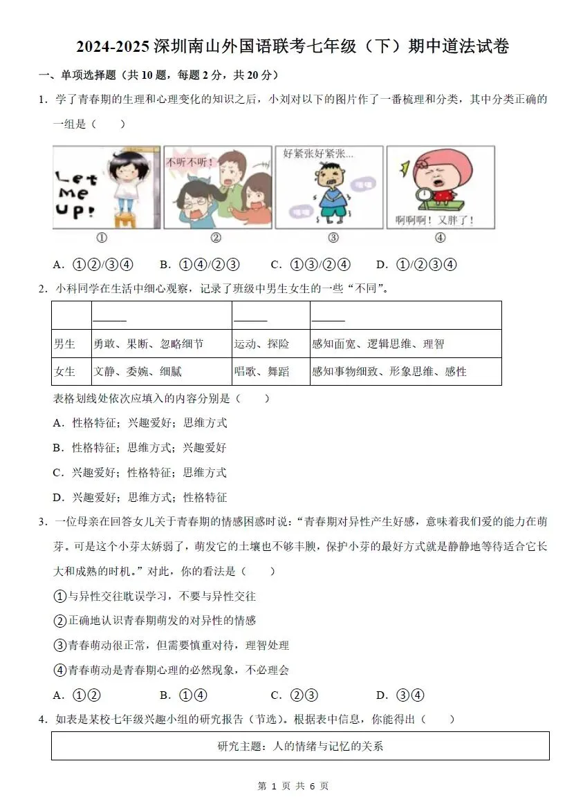 深圳7下期中考试七科真题精练(2026年3月更新)