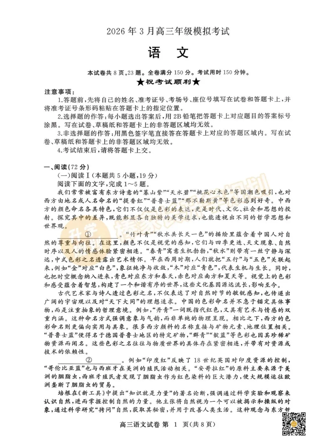 回复【襄阳】,领取2026襄阳高三3月联考试卷答案