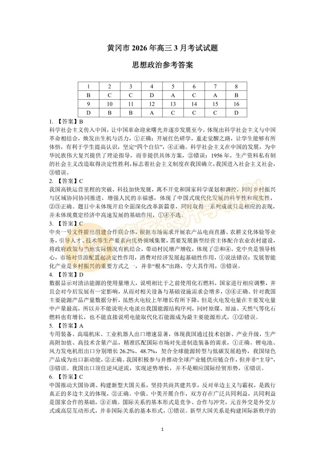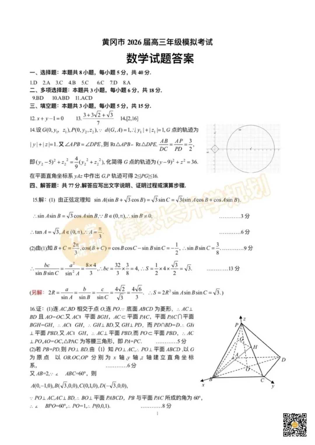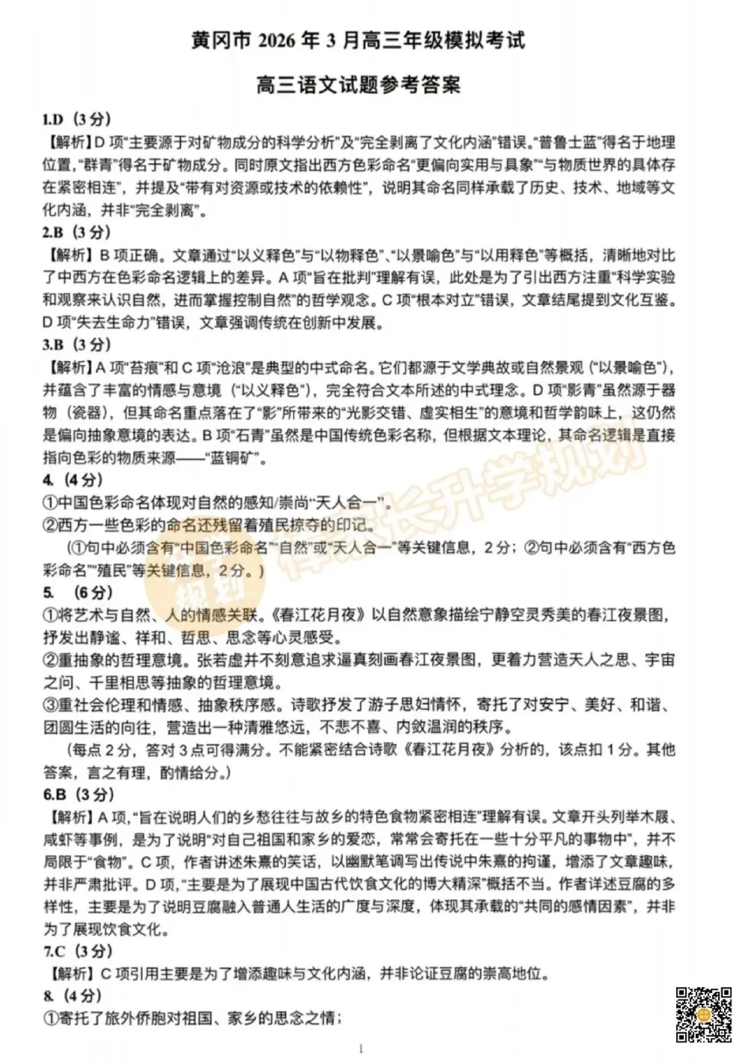 回复【黄冈】,领取2026黄冈高三3月联考试卷答案
