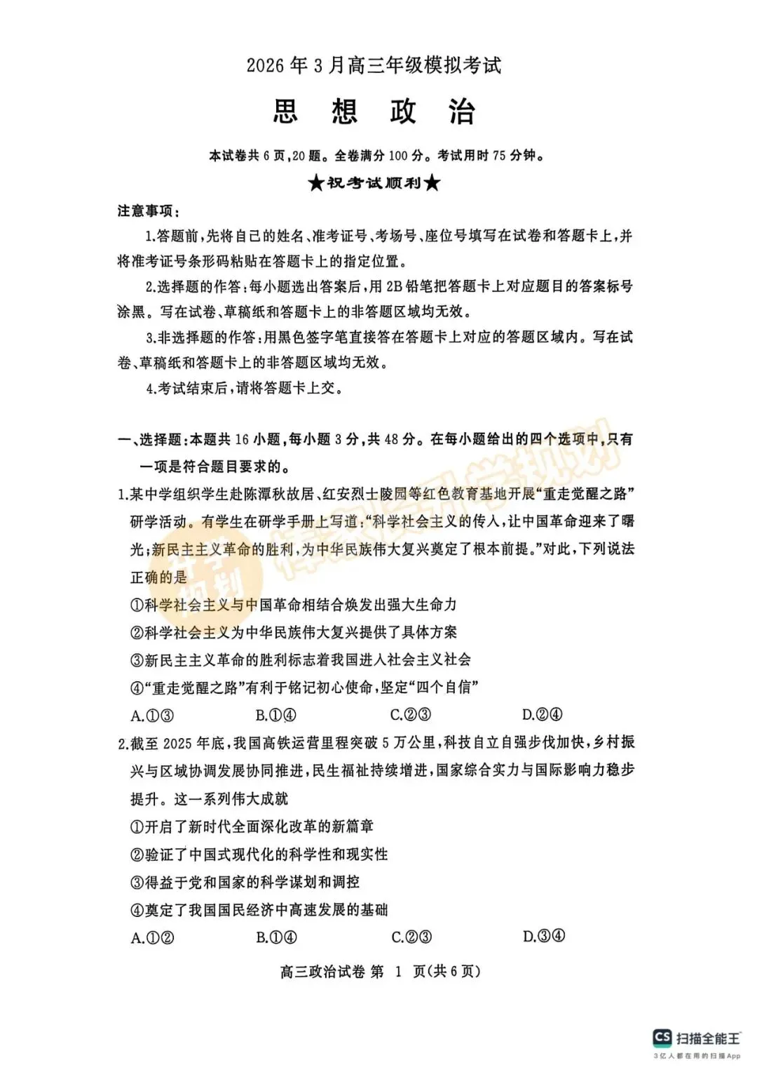 回复【荆州】,领取2026荆州高三3月联考试卷答案