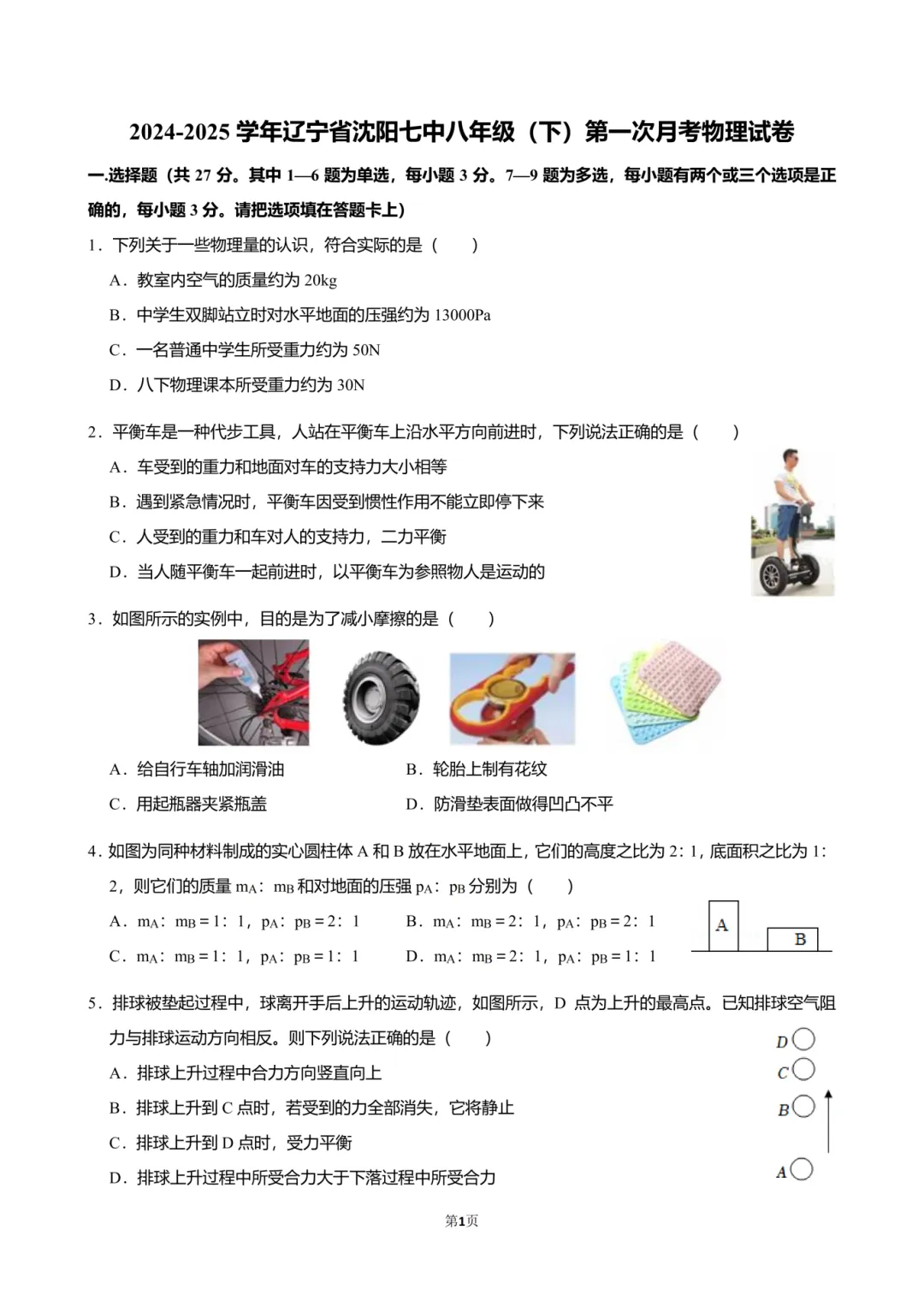 为了更好地帮助同学们备考八(下)第一次月考,YXT物理团队给大家整理了2024-2025学年辽宁省沈阳市七中八年级(下)第一次月考物理试卷、试卷答案、视频讲解。
