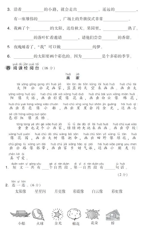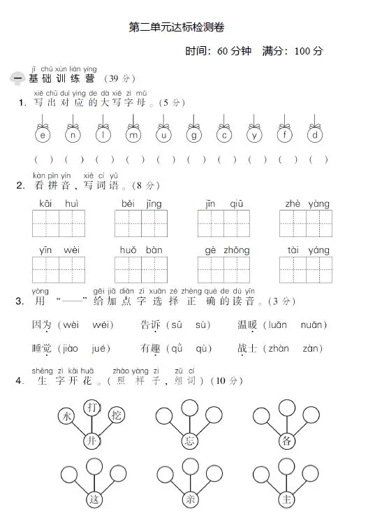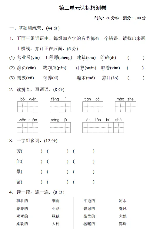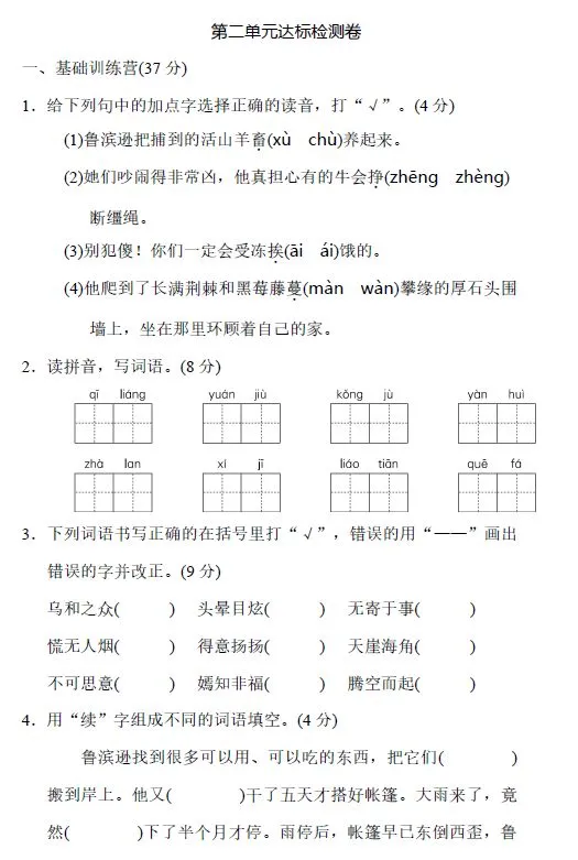 统编版小学语文1-6年级下册第二单元测试题(全部附带答案)