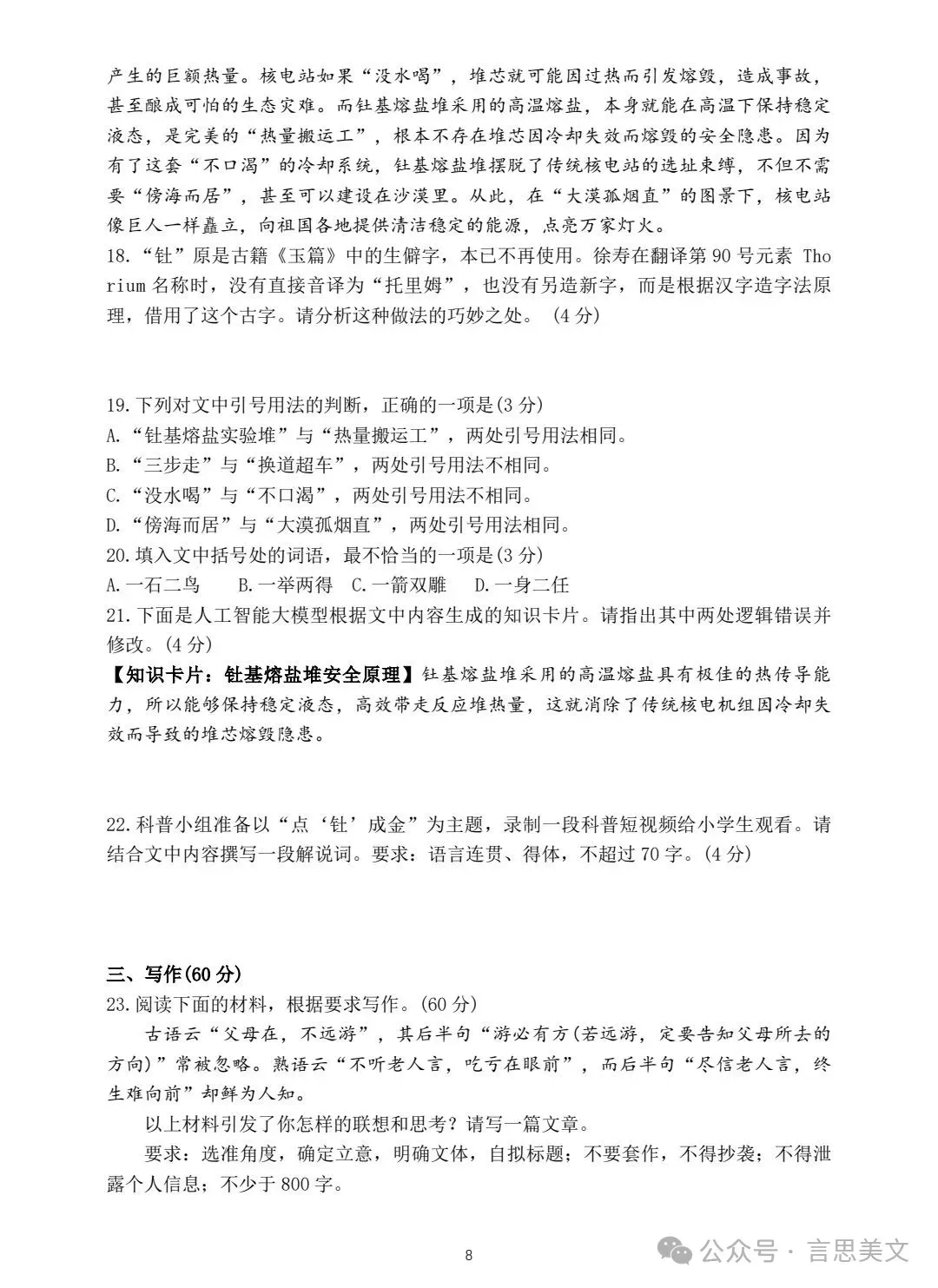 三、写作(60分)23.阅读下面的材料,根据要求写作。(60分) 古语云"父母在,不远游",其后半句"游必有方(若远游,定要告知父母所去的方向)"常被忽略。熟语云"不听老人言,吃亏在眼前",而后半句"尽信老人言,终生难向前"却鲜为人知。 以上材料引发了你怎样的联想和思考?请写一篇文章。 要求:选准角度,确定立意,明确文体,自拟标题:不要套作,不得抄袭:不得泄露个人信息:不少于800字。