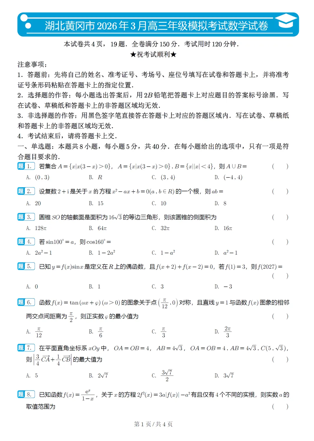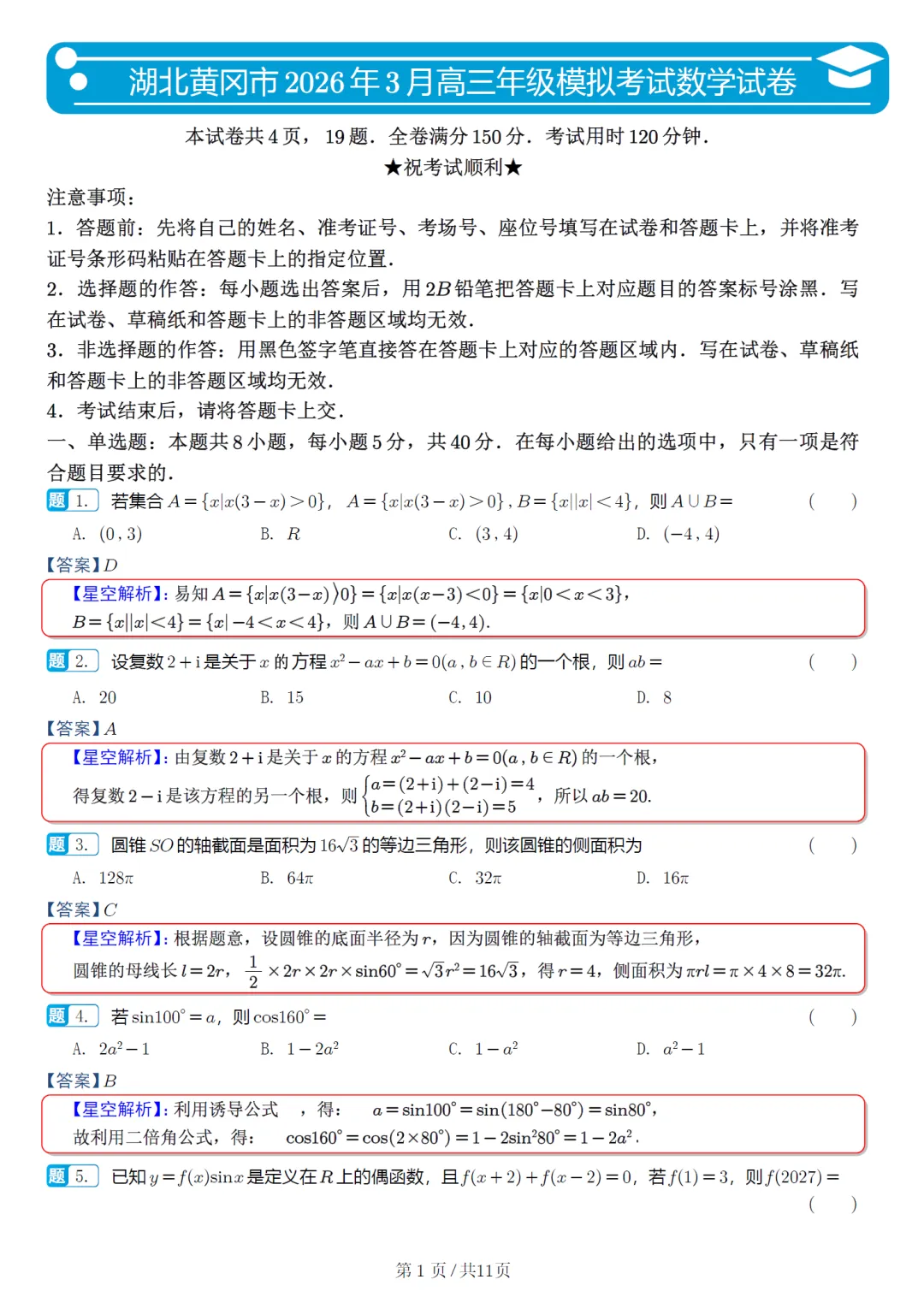 120.2026届湖北黄冈市高三期中数学试卷及逐题解析(2025.11)