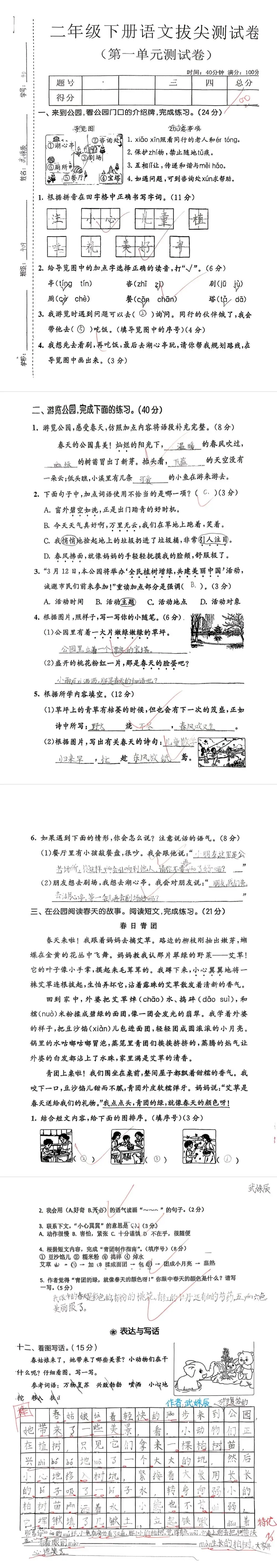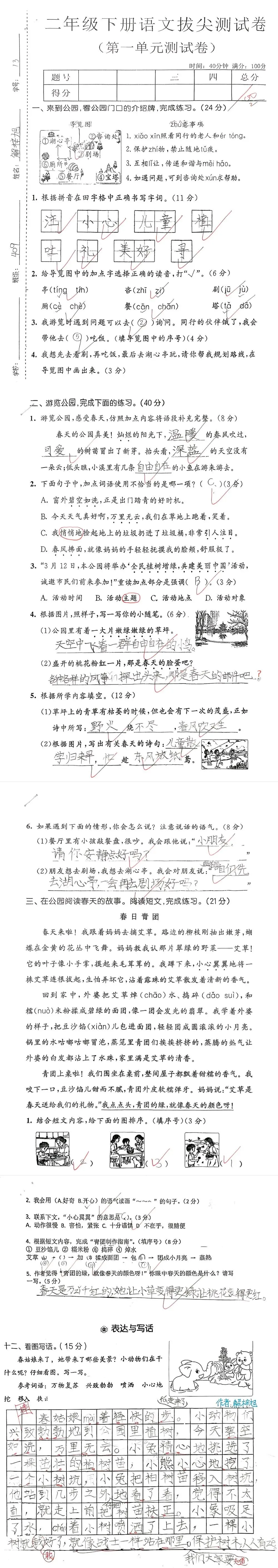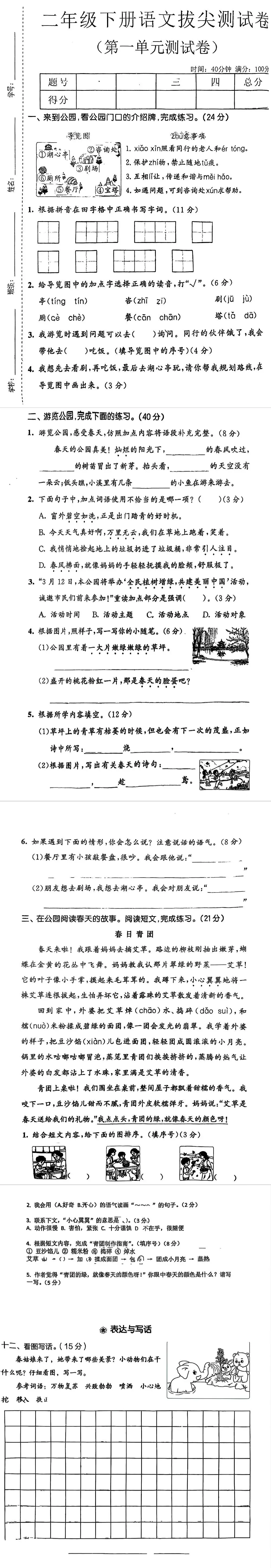 【单元试卷】第一单元精选试题1+答案(二年级下册)