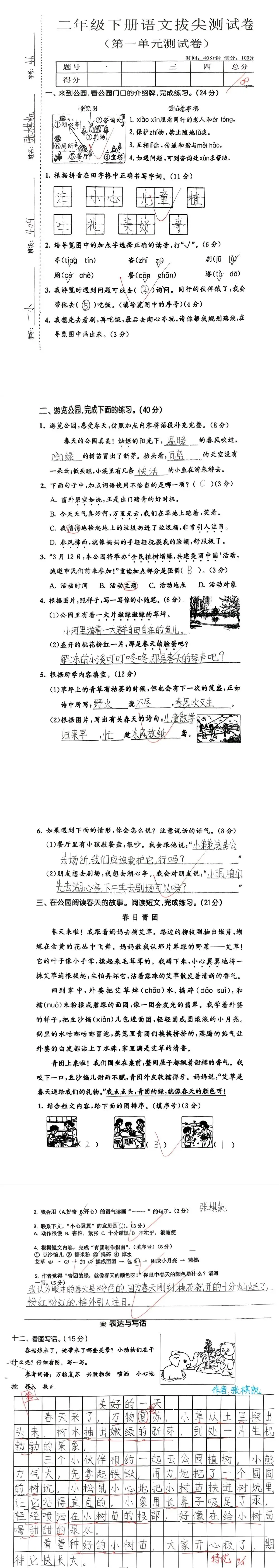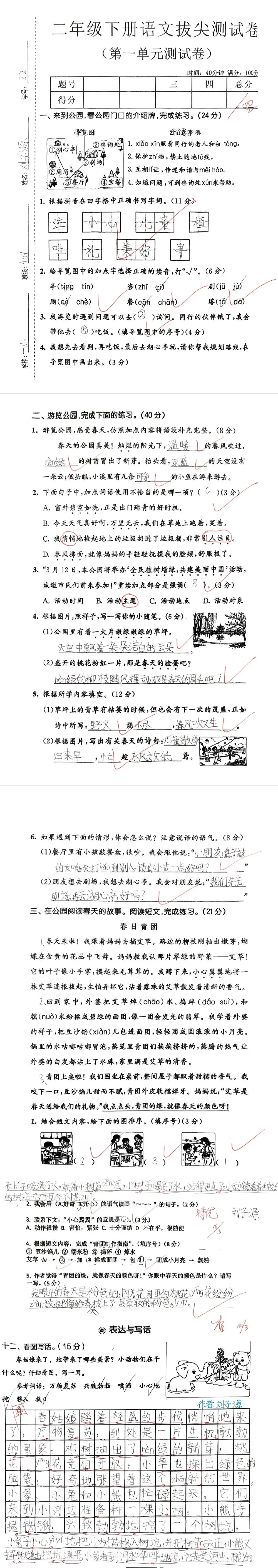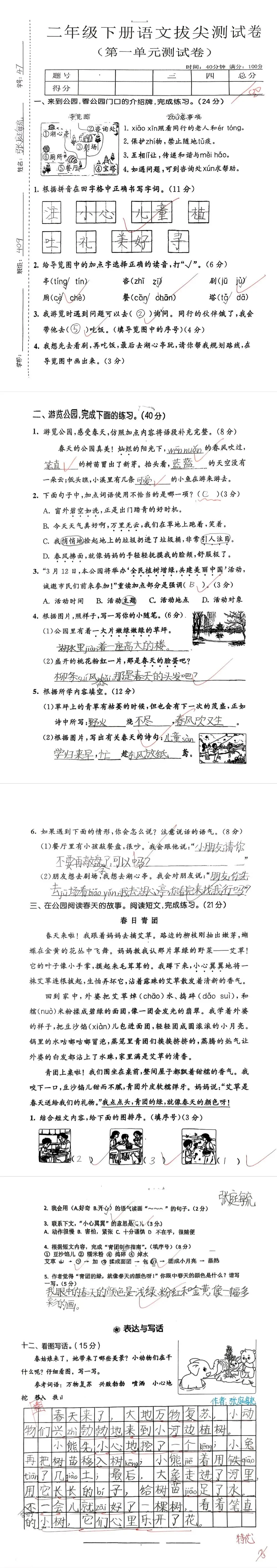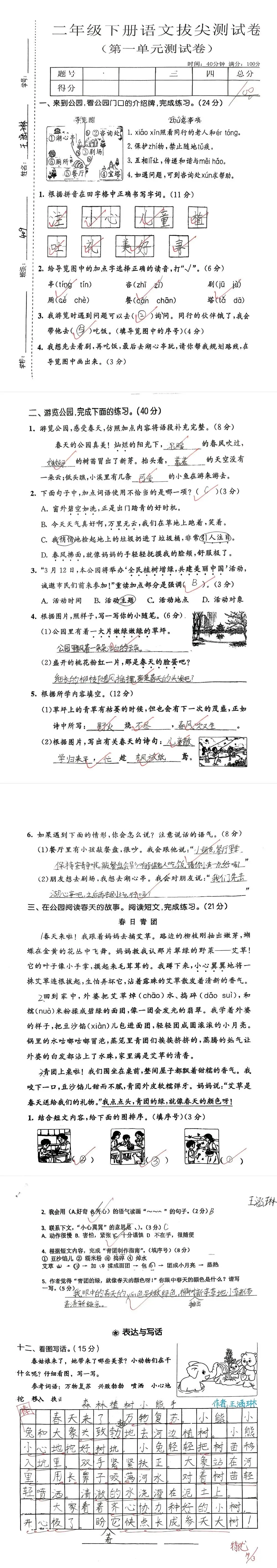 【单元试卷】第一单元精选试题1+答案(二年级下册)