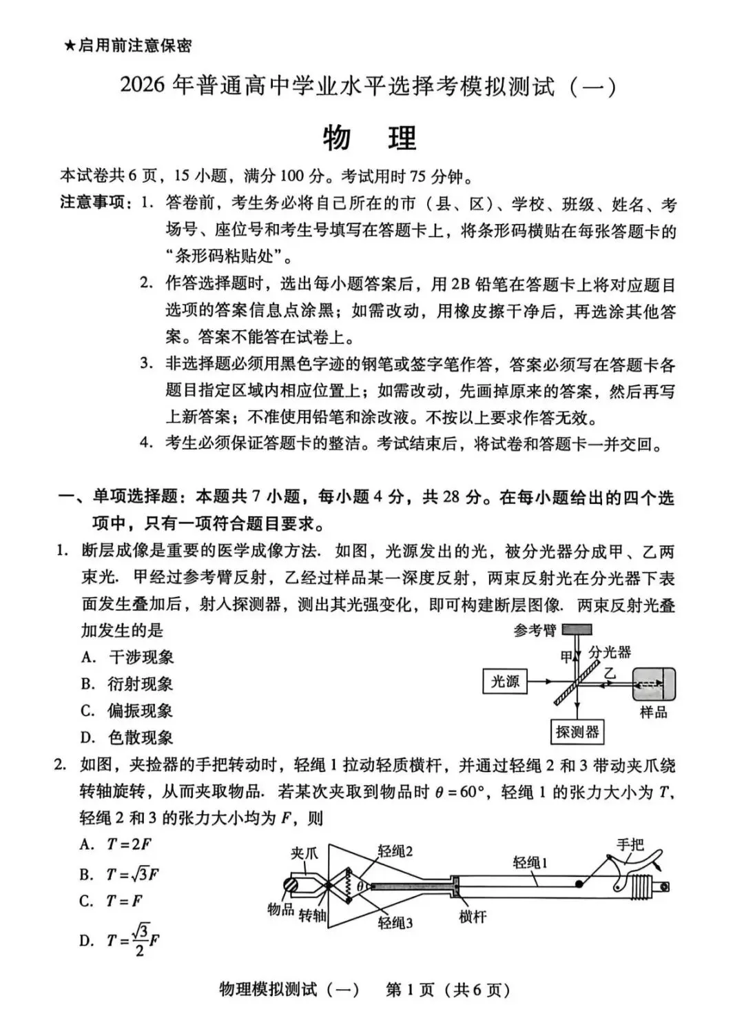 2026年3月广东高三一模物理试卷和参考答案