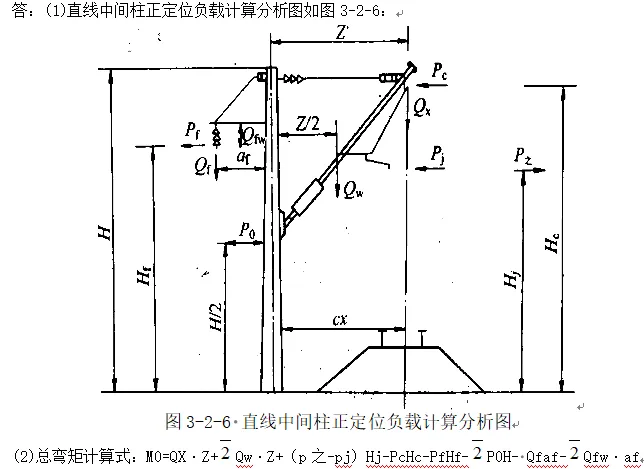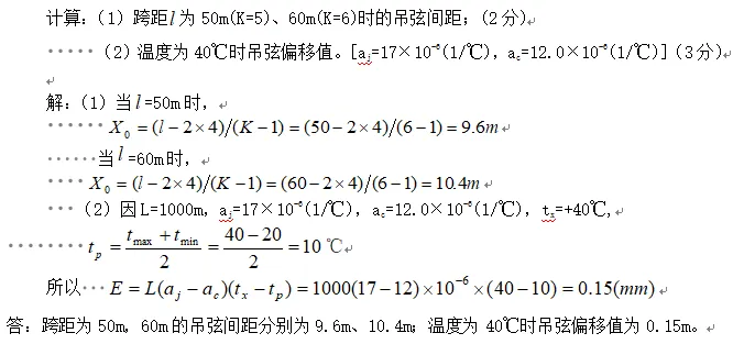 (5分)1、在全补偿简单链形悬挂区段,采用了GJ-70+TCG100,最高气温+40℃,最低气温-20℃,吊弦离中心锚结1000m。计算:(1)跨距为50m(K=5)、60m(K=6)时的吊弦间距;(2分)(2)温度为40℃时吊弦偏移值。[aj=17×10-6(1/℃),ac=12.0×10-6(1/℃)](3分)(5分)2、把电阻R=6Ω,电感L=25.5mH的线圈接到U=220V,f=50HZ的电源上,求电路的电流、功率因数、有功功率、无功功率及视在功率。(6分)3、绘出直线中间柱正定位负载计算分析图(包括附加导线,风从线路侧吹向田野侧)。写出与风吹方向相反的总弯矩计算式。