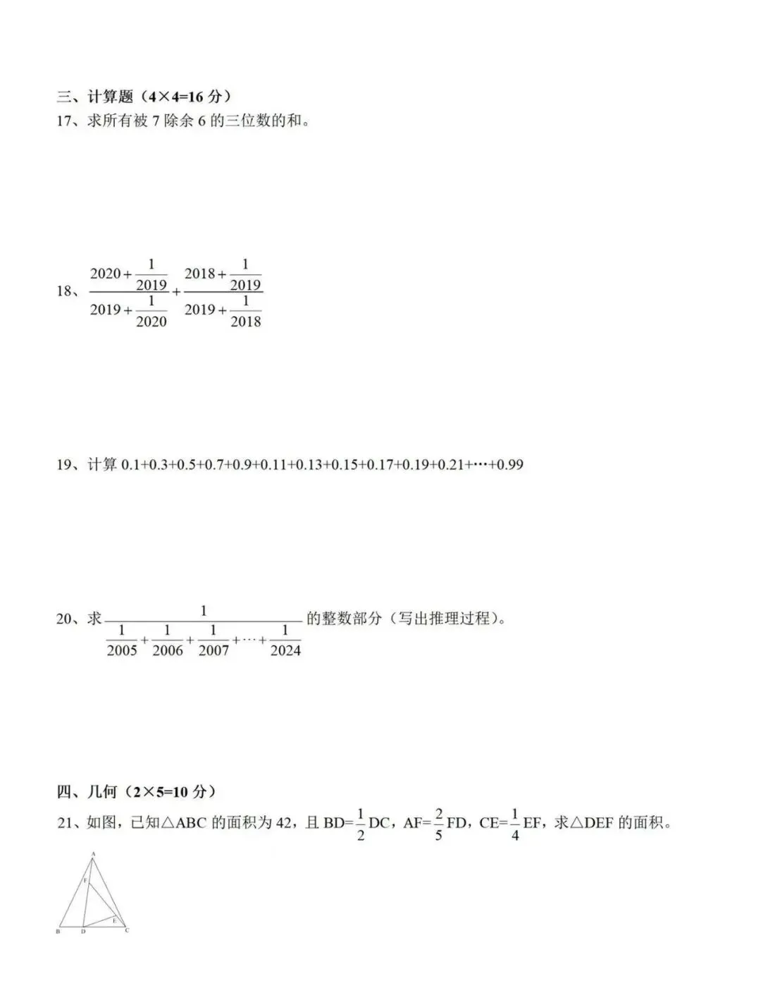 试卷原题:第17题(被7除余6的三位数之和)、第18题(繁分数化简)、第20题(倒数和的整数部分)