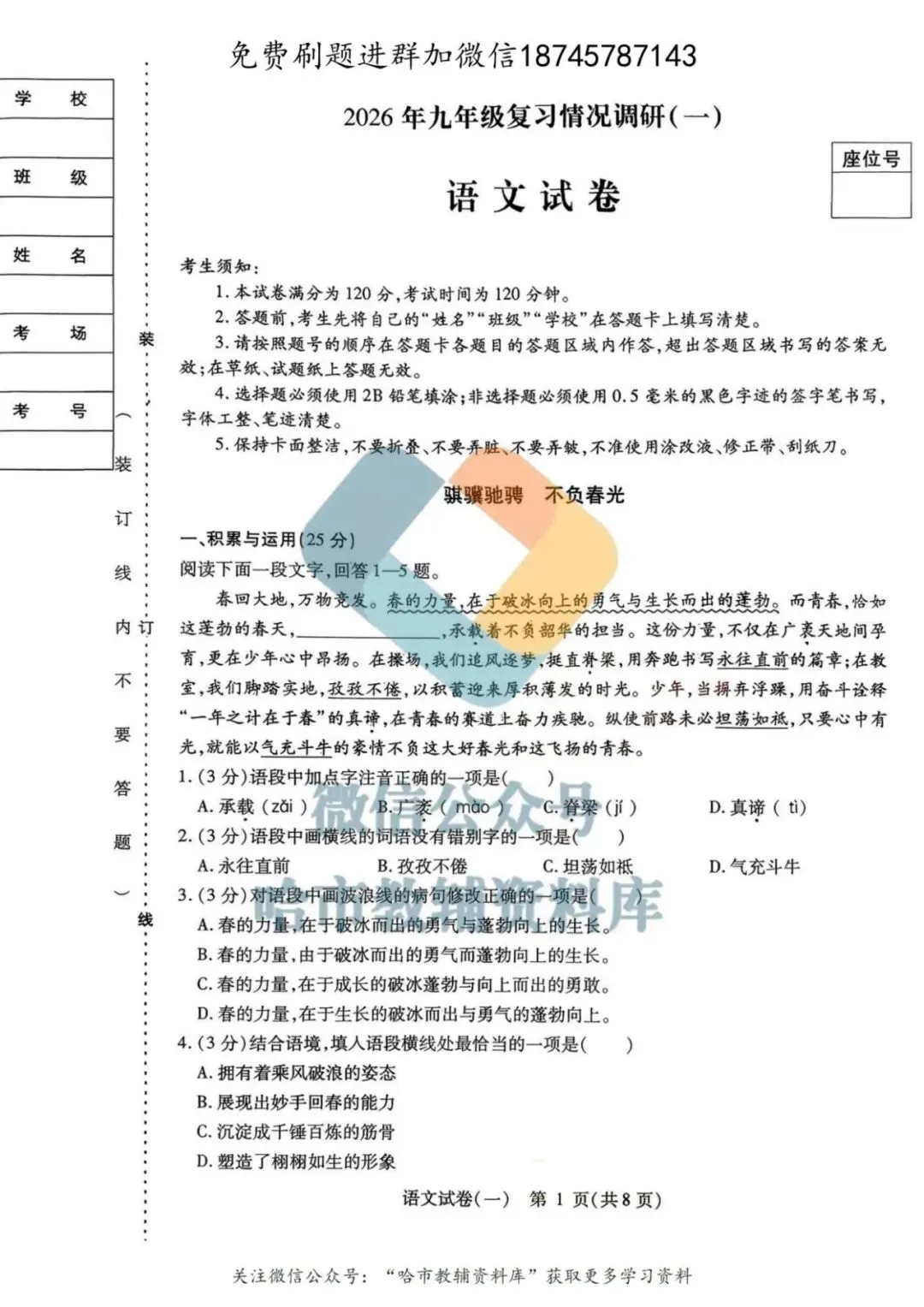 >2026南岗区九年级下语文零模试卷及答案