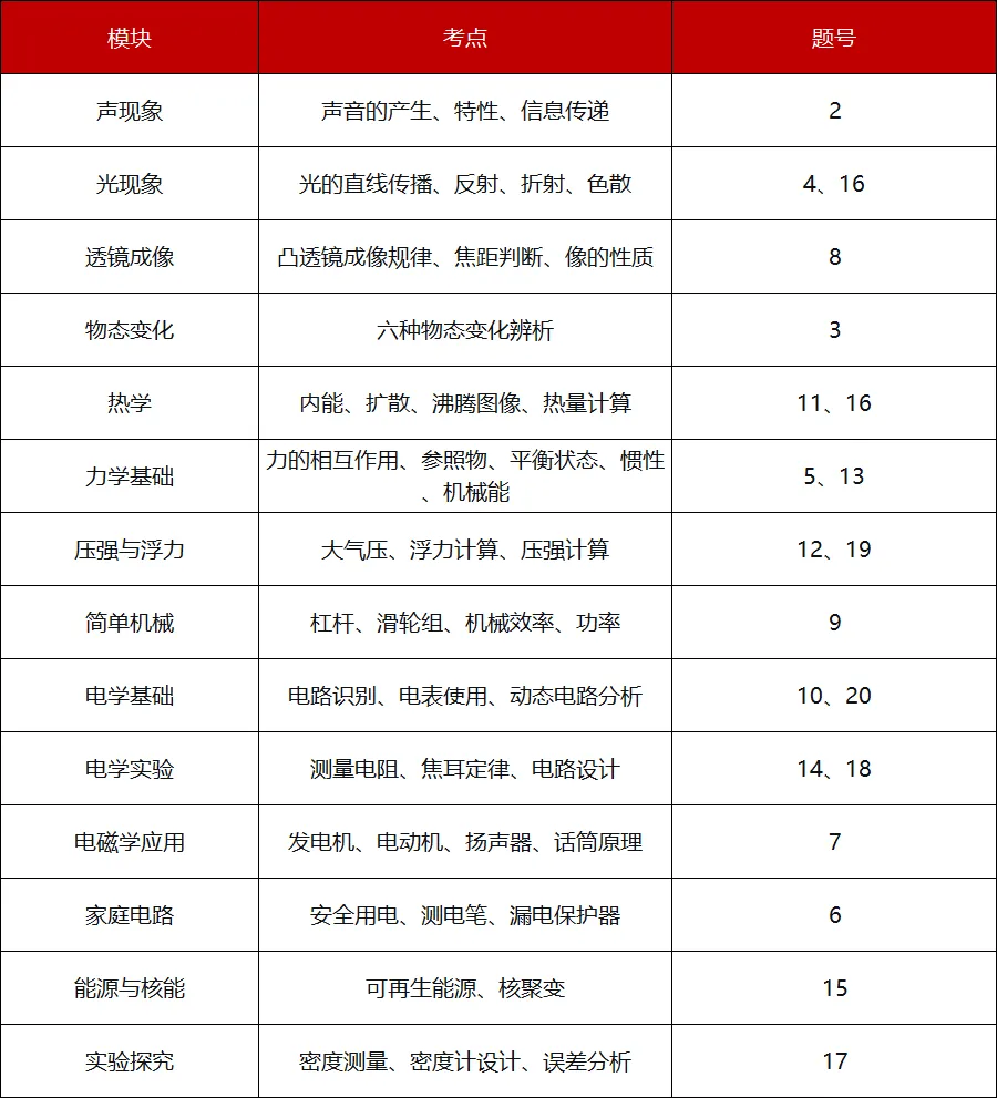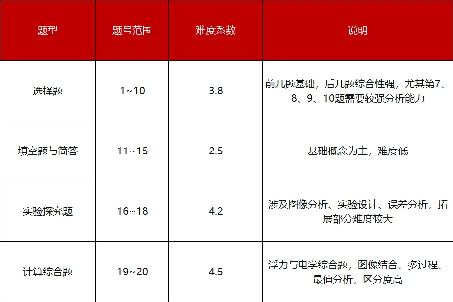 第9题:杠杆、滑轮组、机械效率、功率综合计算,考查公式理解和图像分析能力,难度较大。