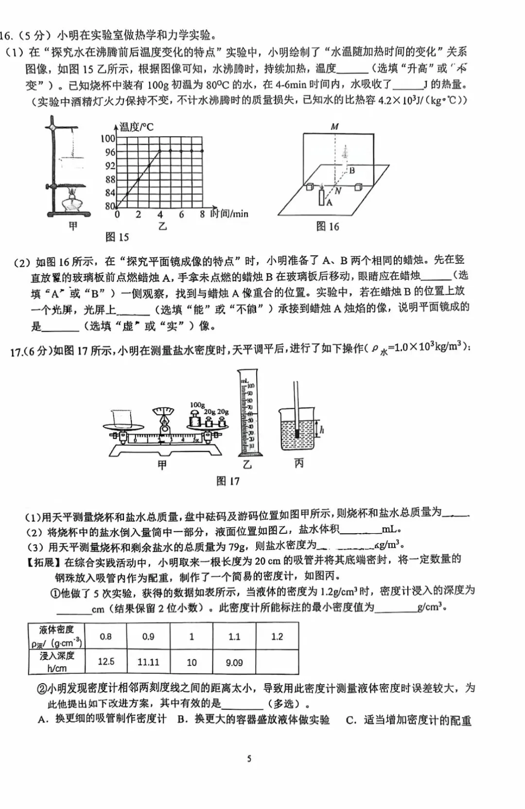 第17题:测量盐水密度实验,涉及天平读数、量筒读数、密度计算,拓展部分考查密度计原理与改进方案,综合性强,难度较大。