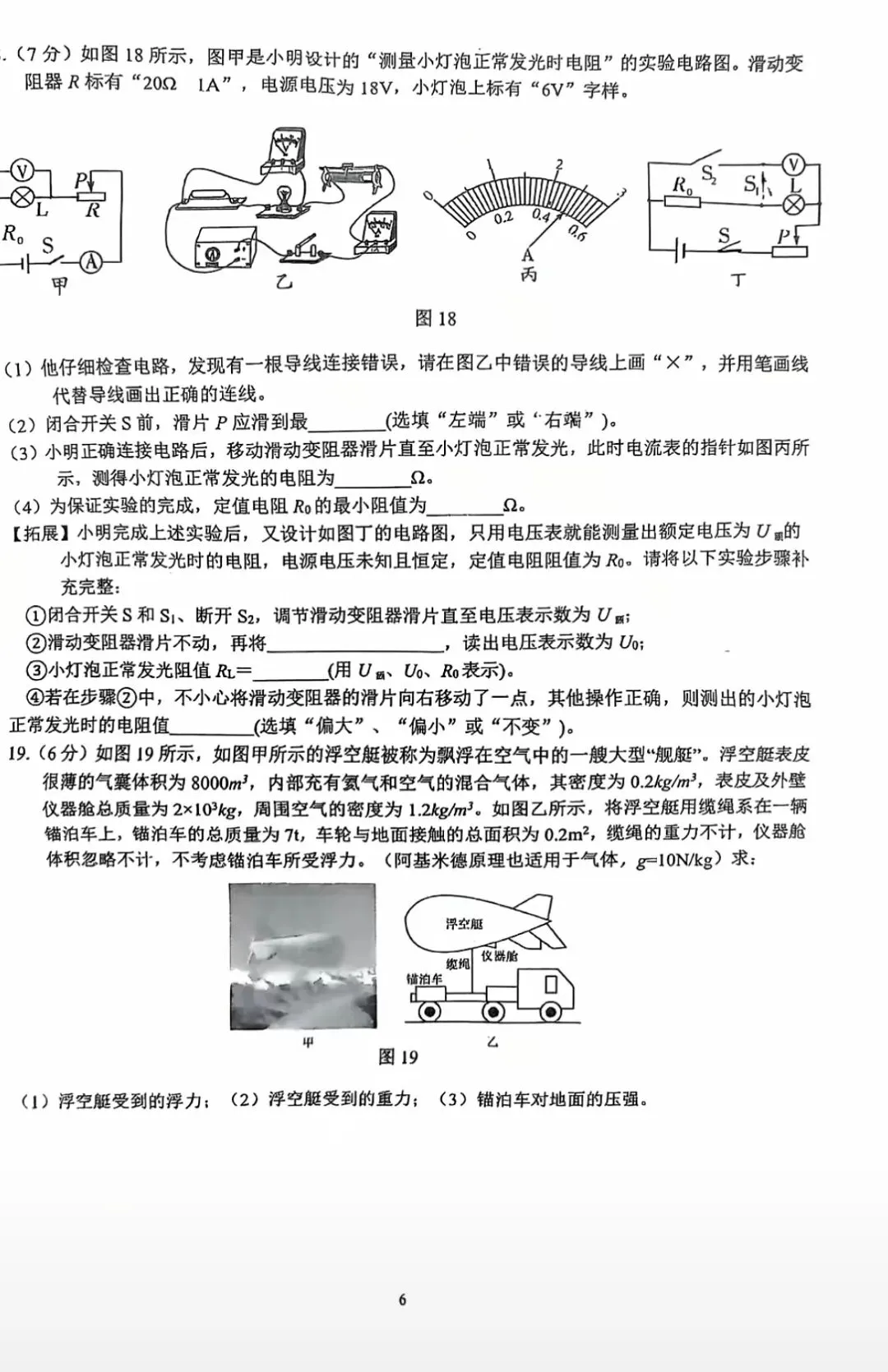 第19题:浮力、重力、压强综合计算,结合浮空艇实际情境,考查阿基米德原理应用,难度中等。