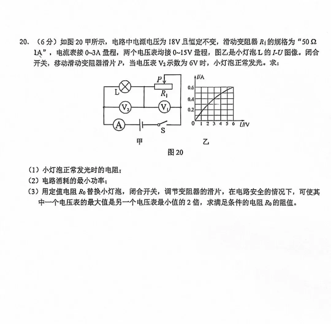 第20题:电学综合题,涉及I-U图像、动态电路、最值问题、替换电阻分析,难度大。