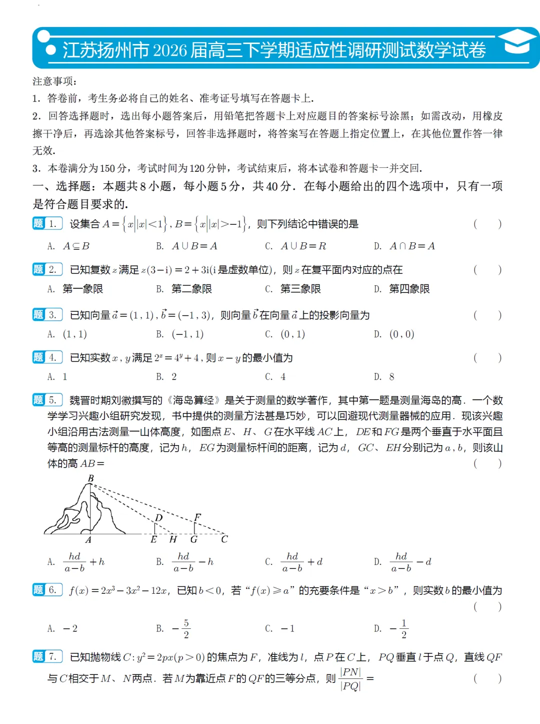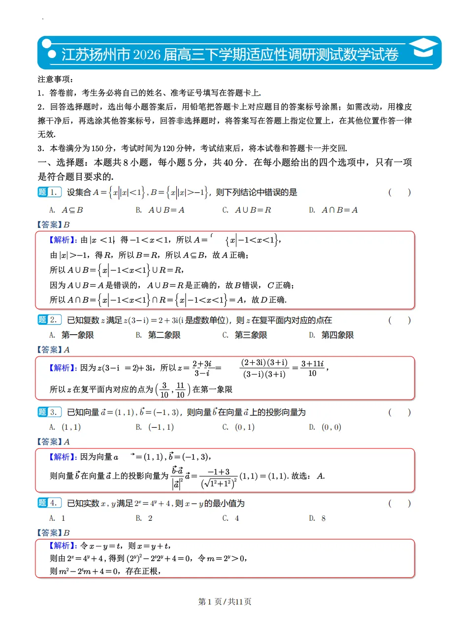 当前位置:首页>考研真题>必刷卷推荐→江苏省扬州市高三模考数学试卷及逐题解析