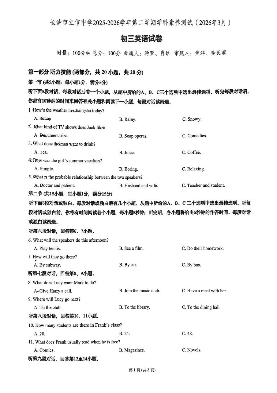 2025~2026年立信集团一模英语试卷分享