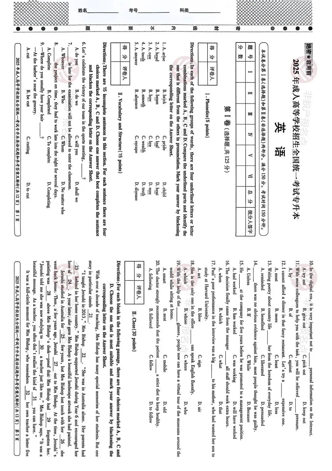 >2025年成人高考真题试卷本科《英语》