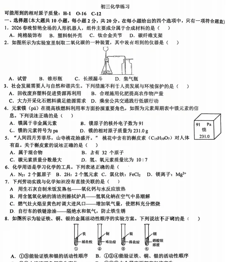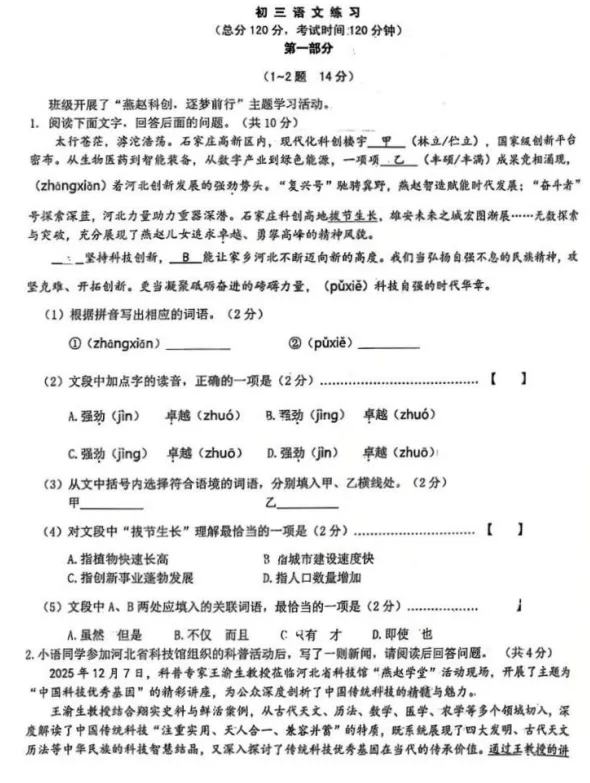 今天给同学们分享的是2026年石家庄裕华区初三模考试卷语文、数学、物理、化学
