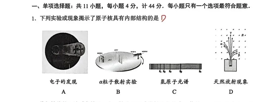 1、第1题: 考察基础知识,原子内部结构:α粒子散射实验
