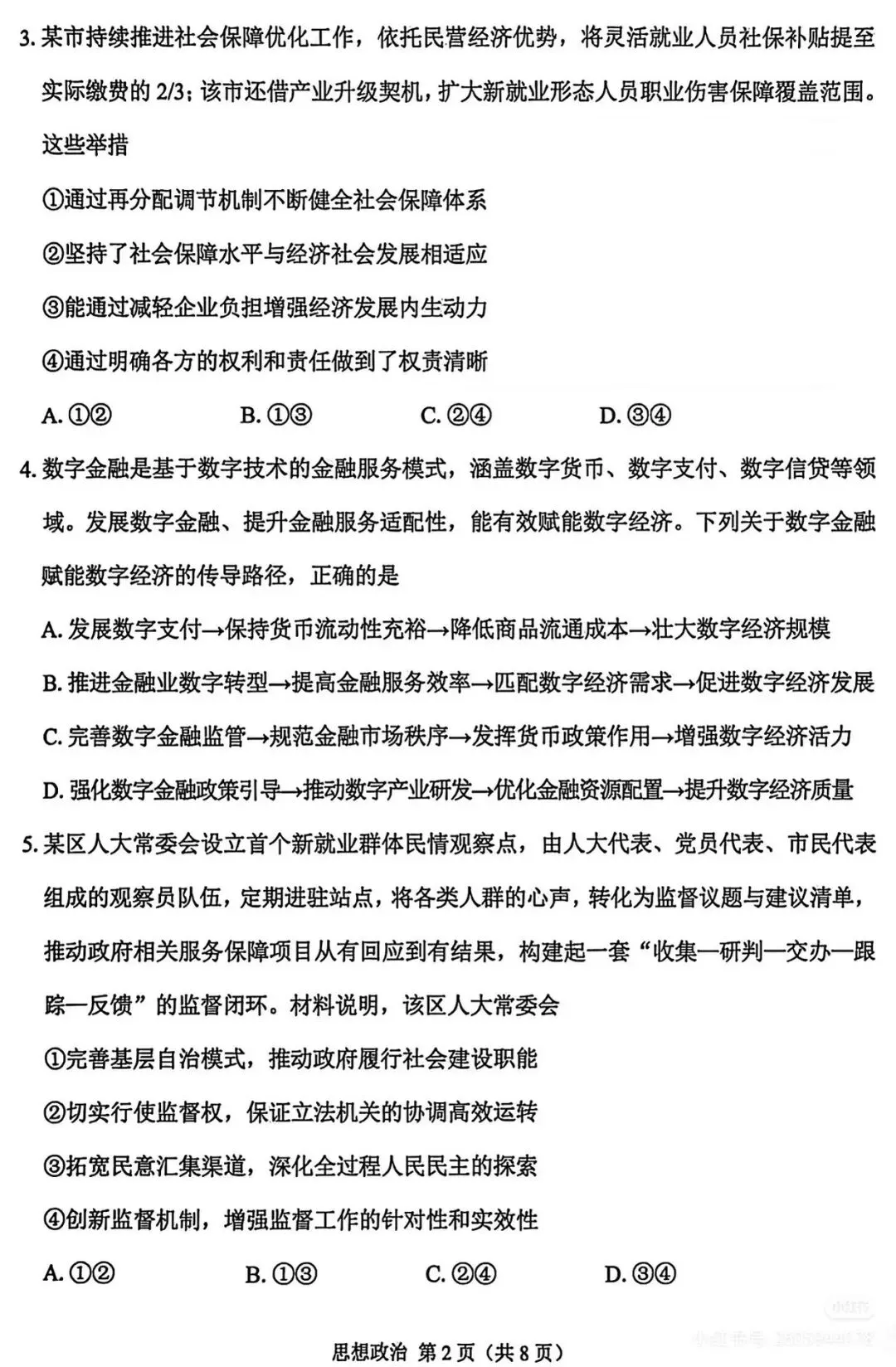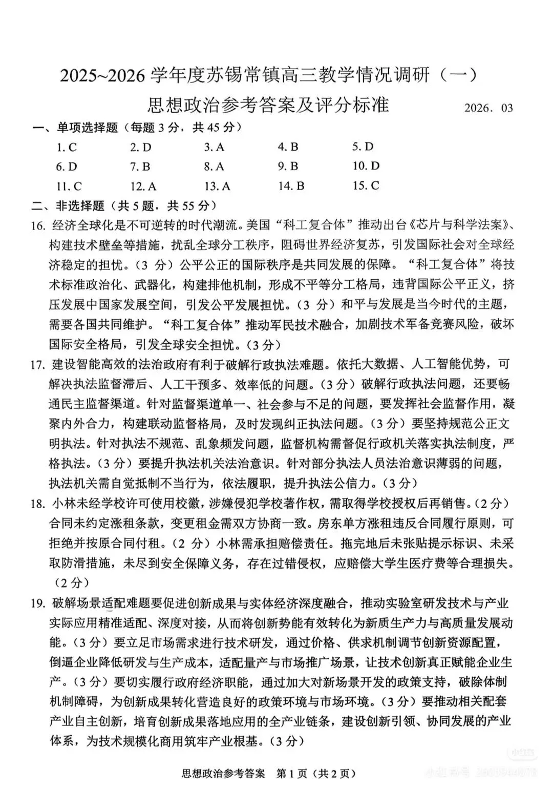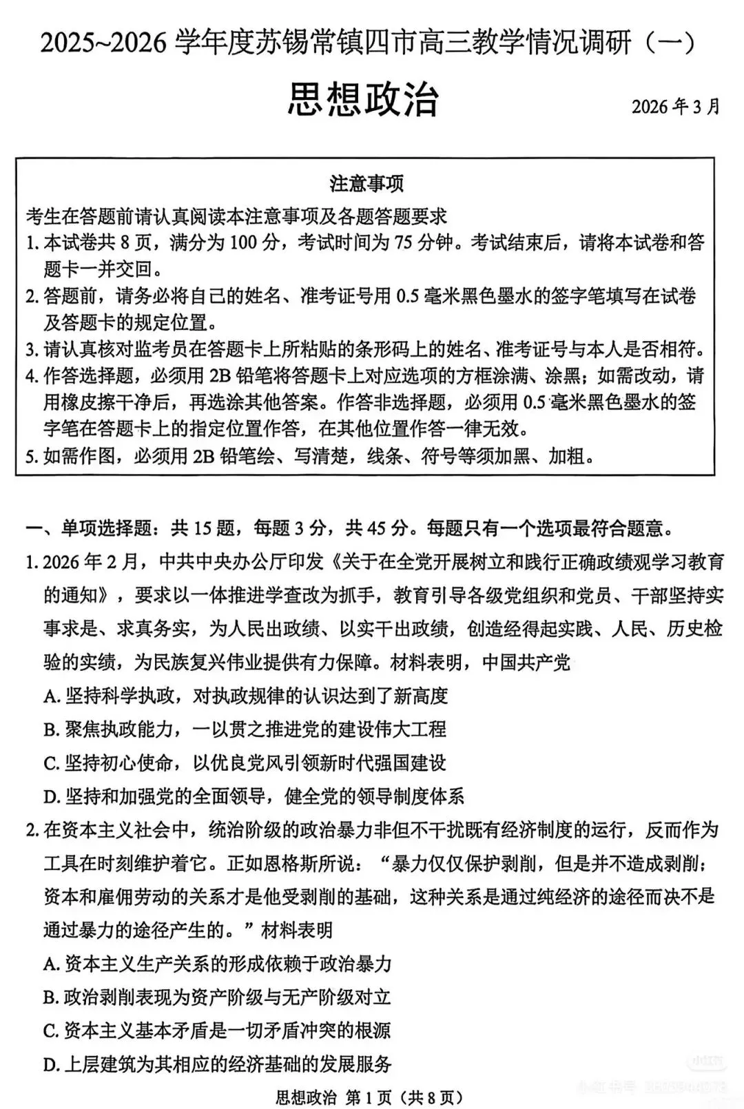 2026届苏锡常镇高三一模政治试卷及答案(转自网络)