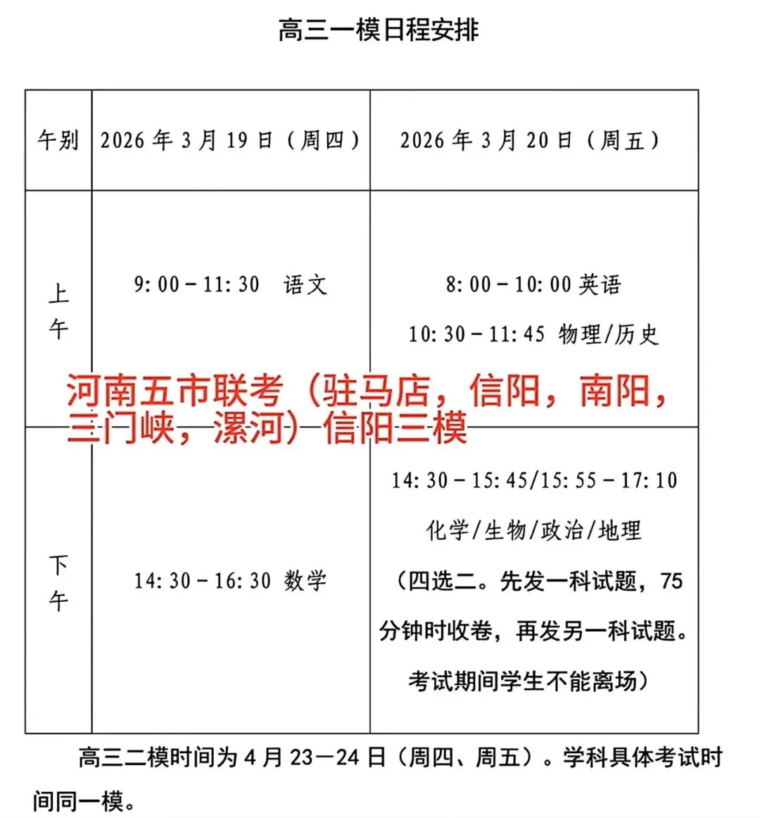 考试名称:河南省五市联考2026年河南省五市高三第一次联考驻马店、南阳市一模、信阳市三模、漯河市、三门峡市二模高三五市联考)