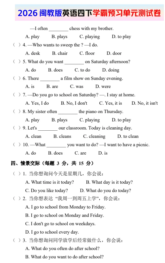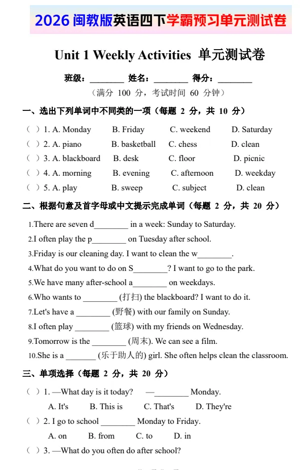 今天给大家分享:2026闽教版英语四下单元、期中、期末试卷 电子版!如果觉得不错的话,可以转发分享到班级群/年级群,让家长打印出来,帮助孩子学习!