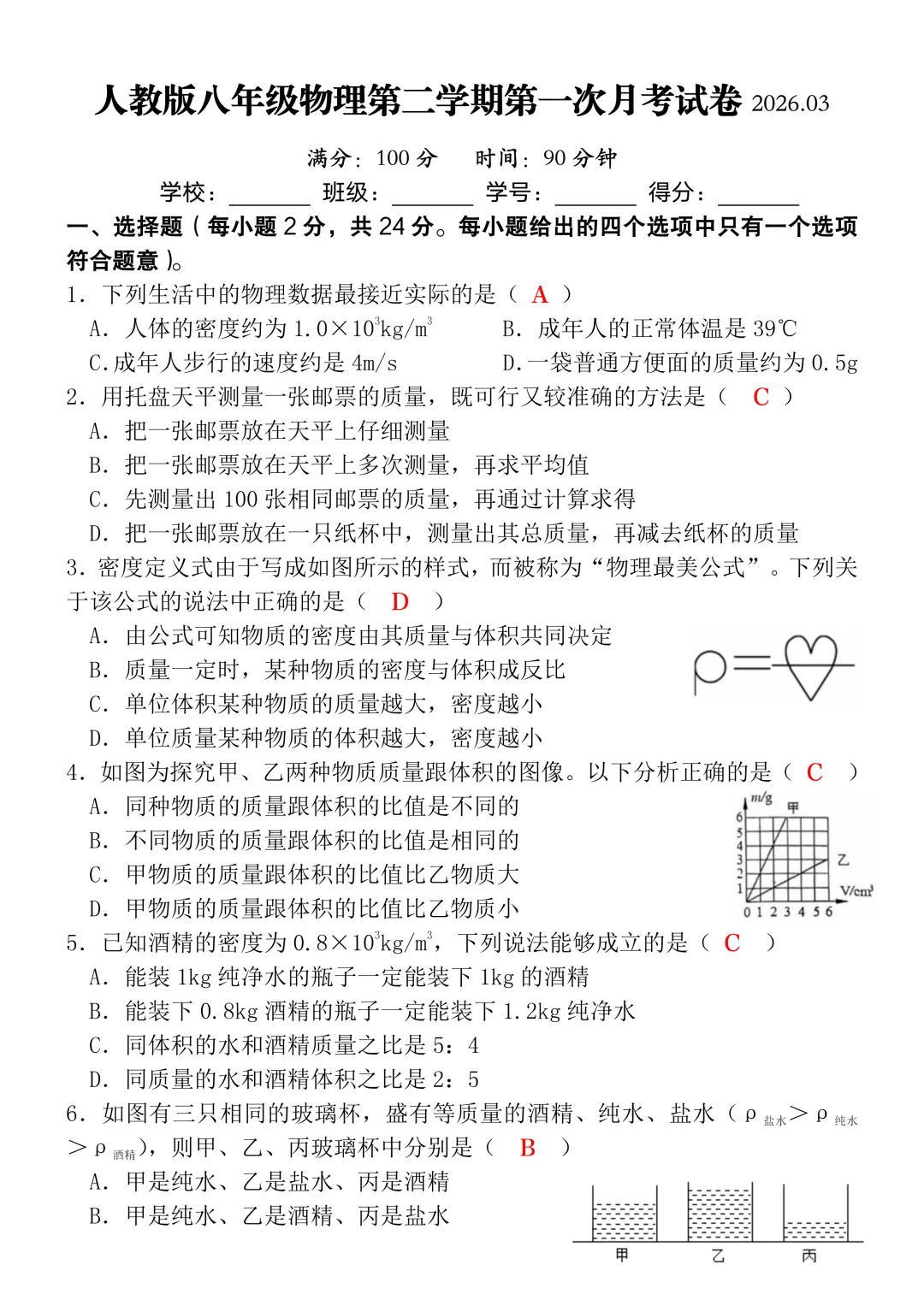 人教版八年级下册物理第一次月考试卷(含答案),稍有难度,打印练习!