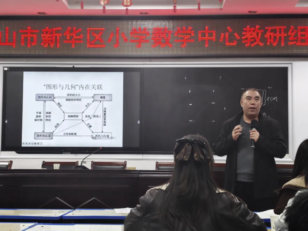 活动最后,张宝贵副主任还围绕小学数学图形与几何领域进行了专题指导,他系统梳理了图形的认识、测量、图形的运动、图形与位置四大板块之间的内在逻辑联系,强调四大内容并非孤立存在,而是层层递进、相互支撑的有机整体。他指出,在教学中要注重知识间的关联与整合,引导学生在观察、操作、探究中建立空间观念,实现从直观感知到理性理解的提升,真正让图形与几何的核心素养落地生根。