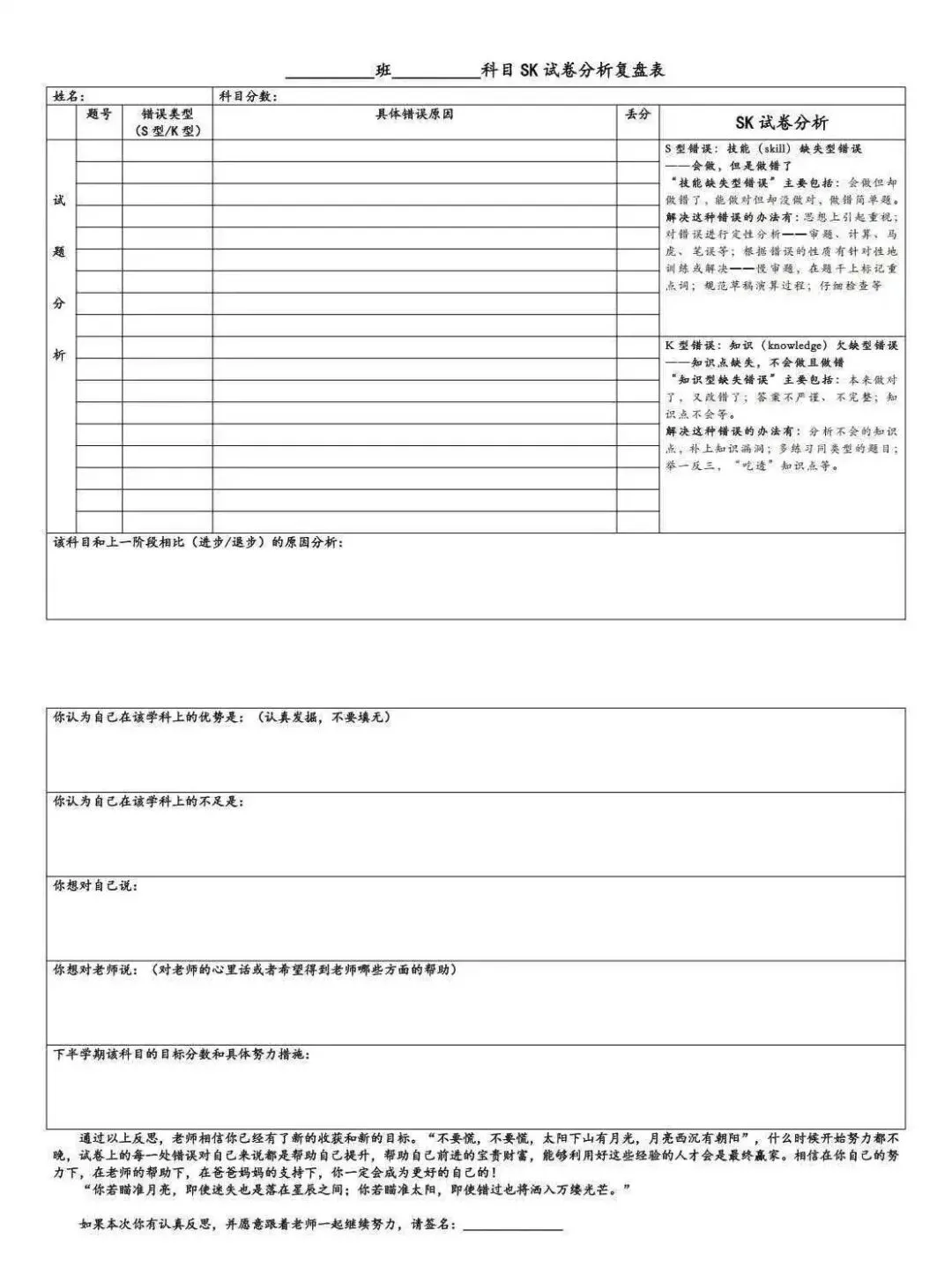 依托SK 试卷分析复盘表制定,核心围绕 S 型(技能缺失)、K 型(知识欠缺)两类错误分类,指导教师高效引导学生完成考后复盘、精准定位学情问题、针对性制定教学策略,同时发挥复盘表的激励与沟通作用,实现以考促学、以评促教的目标。1.引导学生建立科学的考后反思习惯,告别单纯订正答案,学会从“错误类型 - 错误原因 - 解决方法”三层级分析试卷,提升自主学习与问题解决能力。2.帮助教师精准掌握班级整体及学生个体学情,区分技能类疏漏与知识类漏洞,为后续备课、分层教学、个性化辅导提供明确依据。3.搭建师生沟通桥梁,通过表格中的“想对老师说” 板块了解学生诉求,同时以激励性话语强化学生学习信心,营造积极的学科学习氛围。4.推动学生制定可落地的学习目标与措施,将复盘结果转化为后续学习行动,实现成绩的稳步提升。1.考后试卷讲评前 / 后发放复盘表,明确填写对象为八(5)班全体学生,可按学科单张发放,也可根据月考 / 期中 / 期末等考试类型批量发放。2.重点讲解S 型、K 型错误的核心定义与区分要点,结合学科典型例题举例说明,避免学生混淆:S 型错误:核心是“会做但做错”,如审题漏关键词、计算失误、草稿潦草导致抄错答案、笔误、简单题粗心等,与知识掌握无关,属于技能 / 习惯问题;K 型错误:核心是“不会做导致错”,如知识点未掌握、概念混淆、答案不严谨 / 不完整、做对后改错(因知识理解不扎实)、题型拓展后不会举一反三等,属于知识储备问题。3.强调表格填写要求:真实、具体,拒绝“粗心”“不会” 等模糊表述,如 S 型错误需写清 “审题未标记题干中的‘不正确’关键词”,K 型错误需写清 “未掌握一元二次方程的配方步骤”。1.给学生预留 20-30 分钟自主填写时间,要求学生结合批改后的试卷,逐题分析错误,完成 “题号 - 错误类型 - 具体错误原因 - 丢分” 的填写,同时梳理后续板块内容。1.对无法区分 S/K 型错误的学生,结合其错题逐一分析,明确错误本质;2.对错误原因表述模糊的学生,引导其细化描述,如将“计算错” 改为 “分式运算时未通分直接计算,导致结果错误”;3.提醒学生“优势” 板块禁止填 “无”,引导其发掘自身学科亮点,如 “选择题正确率高”“几何证明题思路清晰”“作业完成质量高” 等。1.回收全体学生的复盘表,按班级整体、学生个体、错误类型三个维度进行整理分析,形成学情分析记录:班级整体维度:统计 S 型、K 型错误的占比,梳理班级高频错误题号、高频错误原因,明确班级共性问题(如某一知识点全班超 60% 学生未掌握,或审题粗心成为全班主要 S 型错误);学生个体维度:将学生分为“偏 S 型错误”“偏 K 型错误”“S/K 型错误均较多” 三类,标记尖子生、中等生、学困生的不同问题特点(如尖子生多为 S 型粗心错误,学困生多为 K 型知识漏洞);错误类型维度:汇总各题型(选择、填空、解答 / 论述)的 S/K 型错误分布,如选择题多为 S 型审题错误,解答题多为 K 型知识应用错误。2.对表格中“想对老师说” 板块的学生诉求进行分类记录,如 “希望老师多讲同类题型”“希望放慢知识点讲解速度”“希望增加课堂练习” 等。1.课堂集体反馈:结合班级共性问题,开展针对性的试卷讲评,重点讲解高频 K 型错误的知识点,补充同类练习题;针对全班高频 S 型错误,进行专项技能训练,如 “审题标记训练”“草稿规范训练”“检查方法训练”。1.偏 S 型错误学生:重点强调学习习惯培养,要求其制定个人 “防粗心” 措施,如做题时圈画关键词、草稿纸按题号书写、做完后逐题检查,教师定期抽查其作业 / 练习的书写与审题情况;2.偏 K 型错误学生:为其梳理个人知识漏洞清单,制定补漏计划,安排一对一辅导或小组互助学习,补充基础知识点讲解与基础练习题;3.S/K 型错误均较多学生:先补核心知识漏洞,再纠正学习习惯,降低学习难度,逐步建立学习信心。3.师生一对一沟通:针对学困生、成绩波动较大的学生,结合其复盘表进行单独沟通,肯定其填写中的认真之处,指出核心问题,同时回应其“想对老师说” 的诉求,明确后续辅导方式。1.要求学生认真阅读表格末尾的激励话语,若完成真实反思并确定后续努力方向,在签名处签字,教师对签字后的表格进行存档。2.将复盘表与学生的试卷、成绩册绑定,作为学生学科成长档案的重要内容;后续每次考试后,对比学生的复盘表,跟踪其错误类型、学习习惯、知识掌握的变化,检验辅导与教学效果,及时调整教学策略。