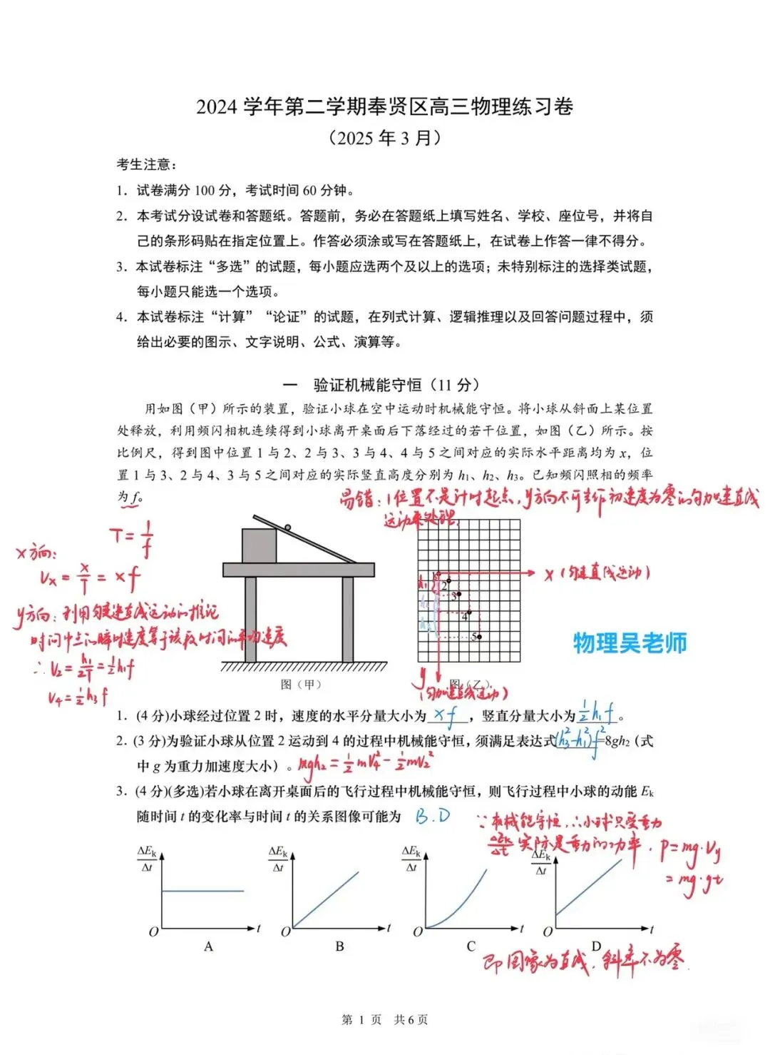 本题总分11分,以频闪相机验证小球空中运动机械能守恒为情境命题。给出实验参数,要求计算位置2的速度分量,推导机械能守恒满足的表达式,还要选择动能随时间变化率的对应图像。