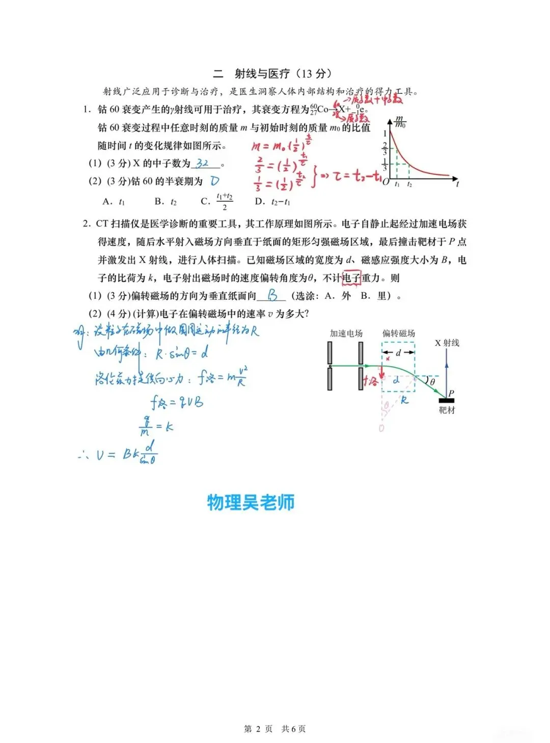 第一部分围绕钴60衰变,要求计算衰变产物X的中子数,选择钴60的半衰期。第二部分围绕CT扫描仪的偏转磁场,要求判断磁场方向,计算电子在偏转磁场中的速率。