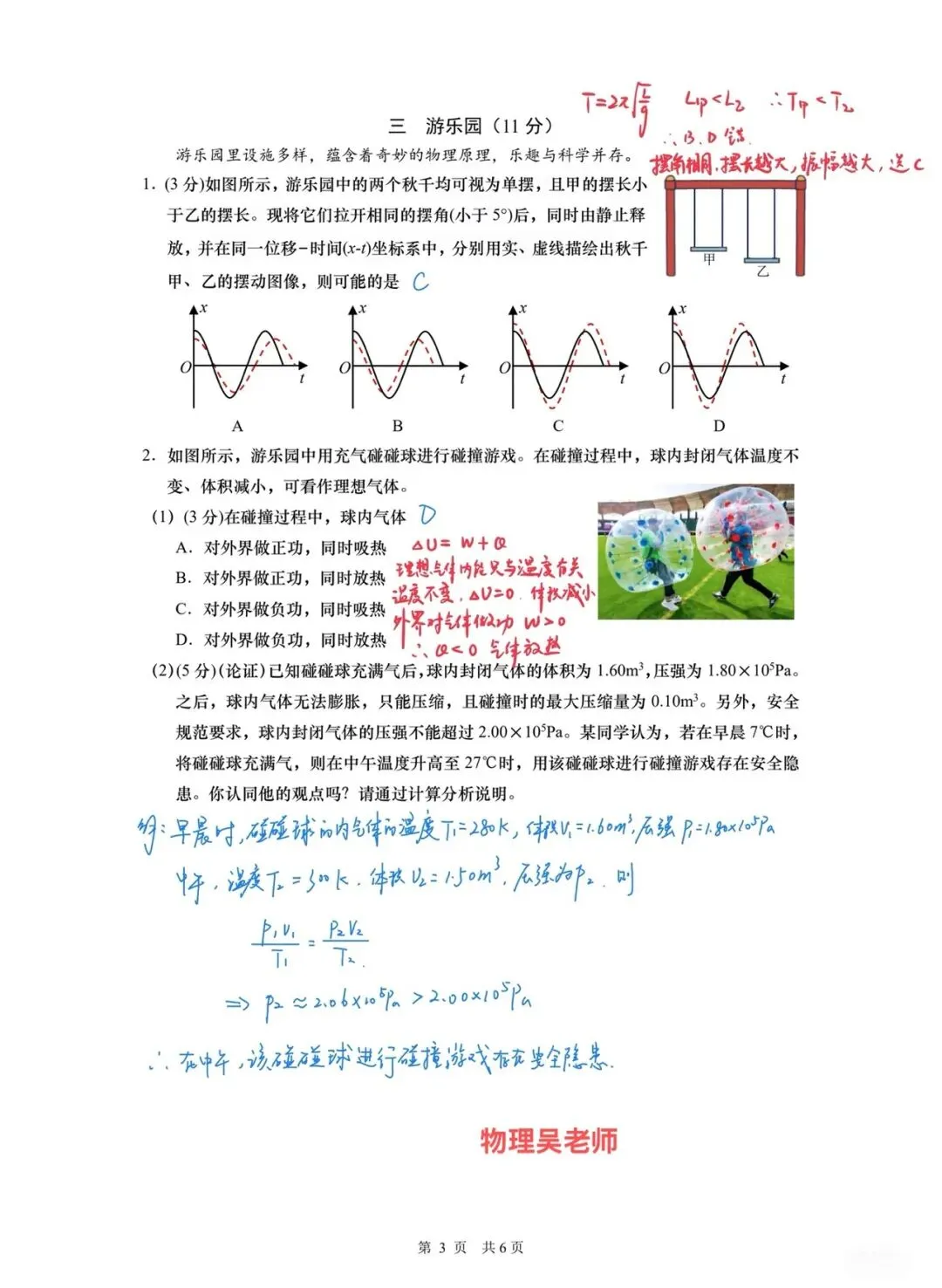 本题总分11分,以游乐园设施为情境命题。第一部分考查单摆知识,要求判断不同摆长秋千的位移时间图像。第二部分围绕充气碰碰球碰撞,考查理想气体性质,要求判断碰撞过程中气体的做功和吸放热情况,还要通过计算论证特定充气条件下碰碰球是否存在安全隐患。