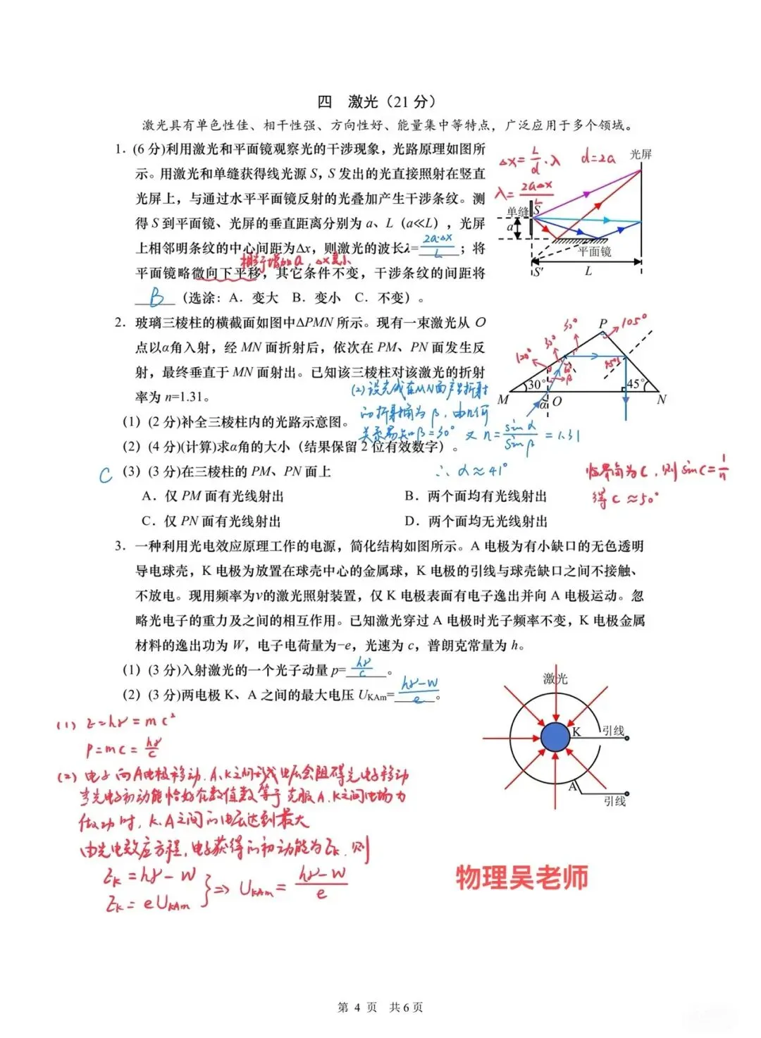 本题总分21分,围绕激光的应用设置多道小题。第一部分考查激光干涉,要求计算激光波长,判断平面镜平移后干涉条纹间距的变化。第二部分考查激光在三棱柱中的折射反射,要求补全光路,计算入射角大小,判断两个面是否有光线射出。第三部分考查光电效应电源,要求计算入射光子的动量,计算两电极之间的最大电压
