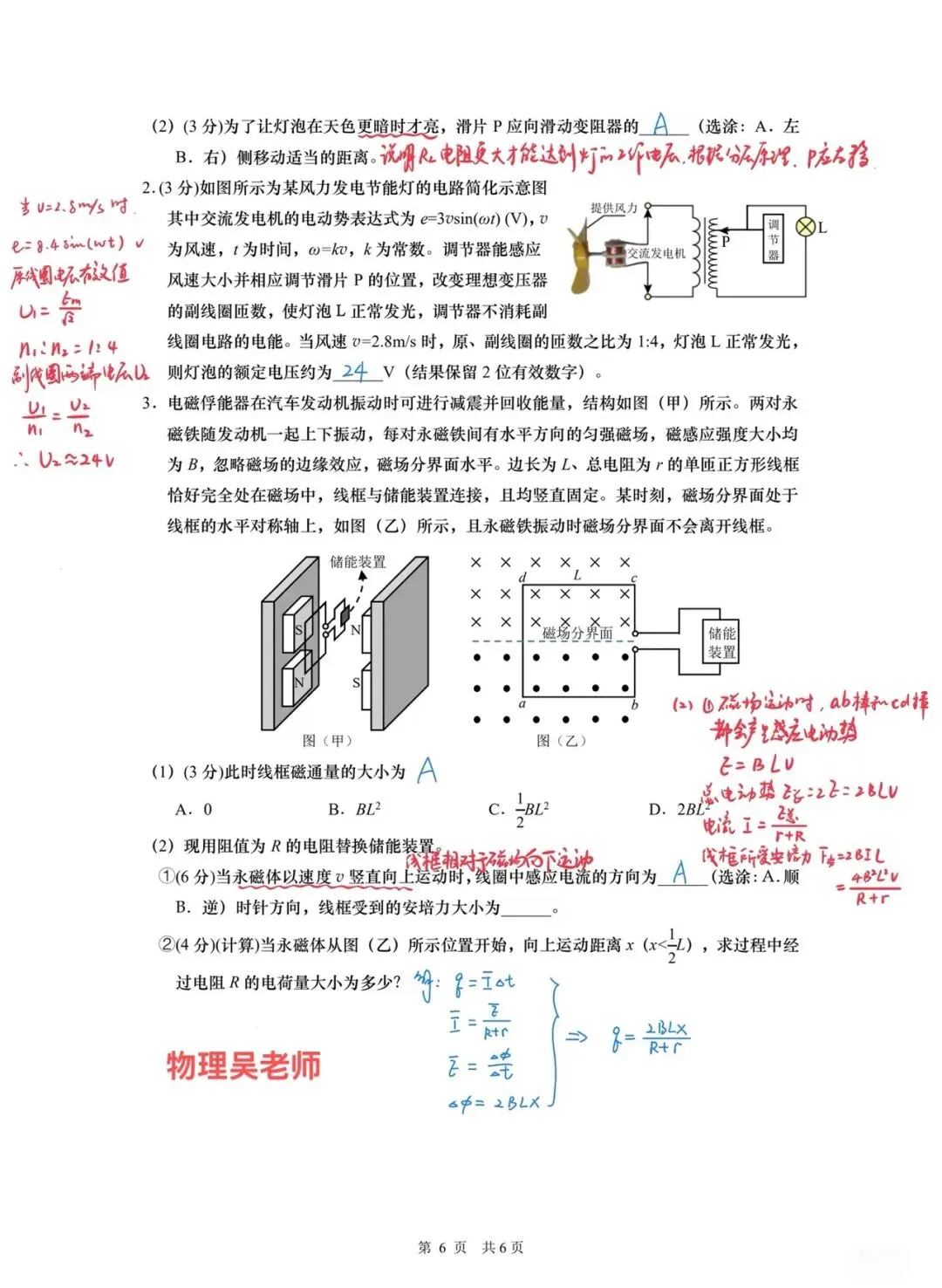 阻器滑片的方向。第二部分考查风力发电节能灯电路,要求计算灯泡的额定电压。第三部分考查电磁俘能器,要求判断对应位置的线框磁通量大小,判断感应电流方向、计算安培力大小,还要求计算永磁体向上运动后经过电阻的电荷量。