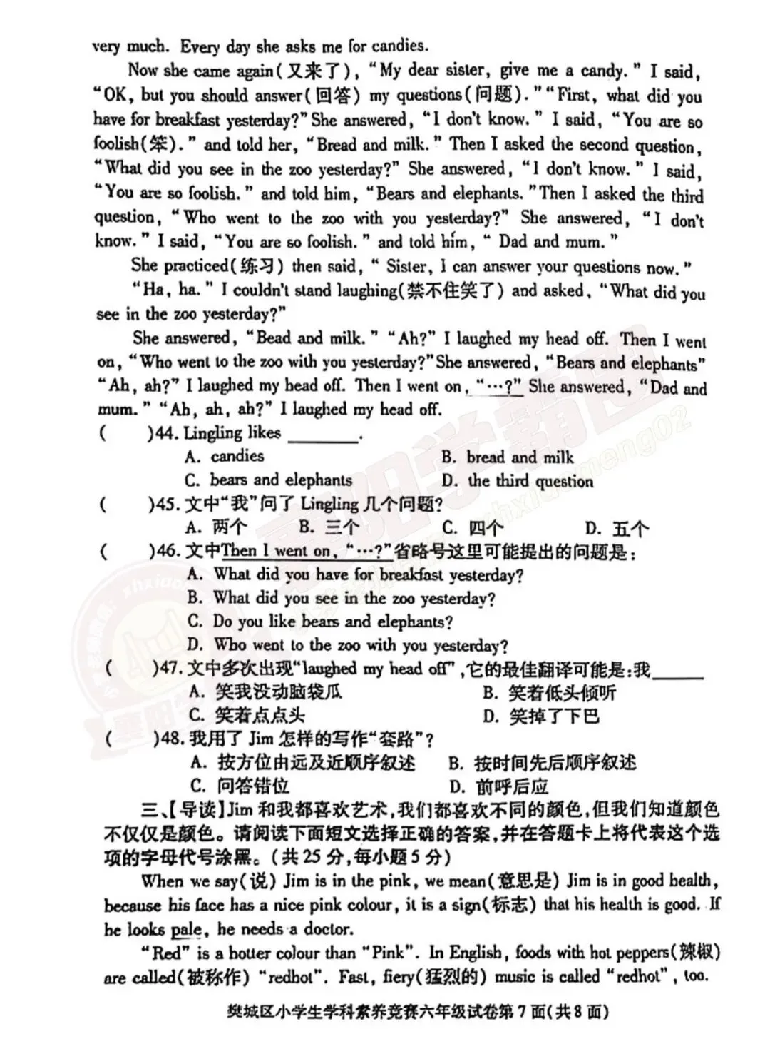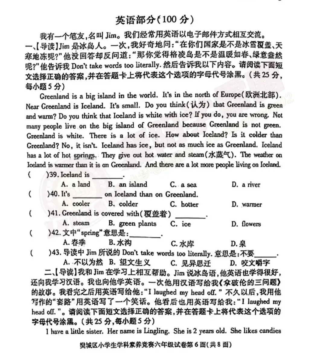 >6年级樊城区往年素养考试英语真题卷