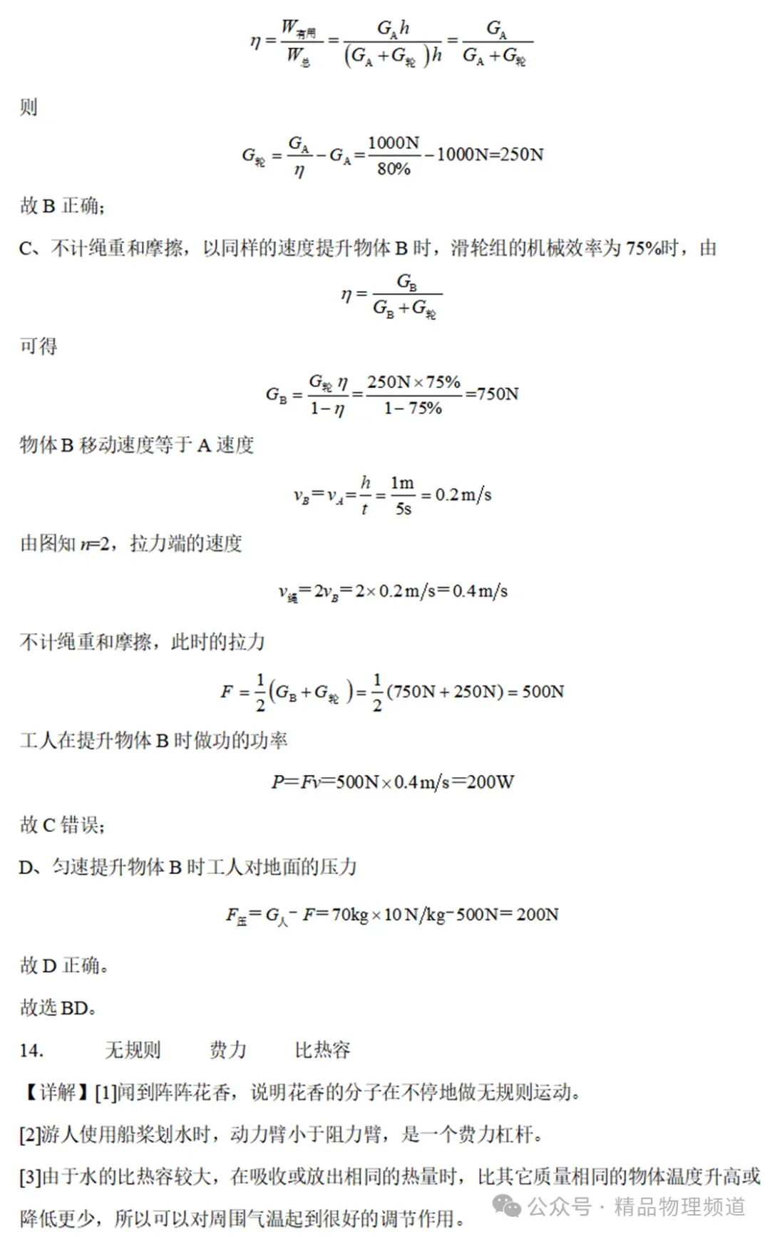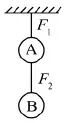13.如图所示,质量为70kg的工人利用滑轮组先后竖直向上匀速提升物体A和物体B。当提升物体A时,工人在5s内将质量为100kg的物体A提升1m,此时滑轮组的机械效率为80%;当用同样的速度提升物体B时,滑轮组的机械效率为75%。假设在拉绳子的过程中,工人对绳子的拉力与对地面的压力始终竖直向下且在同一直线上,不计绳重和摩擦。g取10Nkg。则下列说法正确的是( )14.湿地公园内,湖面碧波荡漾,两岸滩地草木茵茵,令游人留连忘返。漫步在湖边林阴道上,闻到阵阵花香,这是因为分子在不停的做运动,游人在湖上划船,船桨实际上是杠杆,湿地公园对周围气温起到很好的调节作用,这是由于水的较大。15.两个质量分别为mA、mB都带正电荷的小球,用绝缘轻质细线拴住,如图所示;则请判断两根细线上拉力F1、F2大小(选填“>”、“<”或“=”):