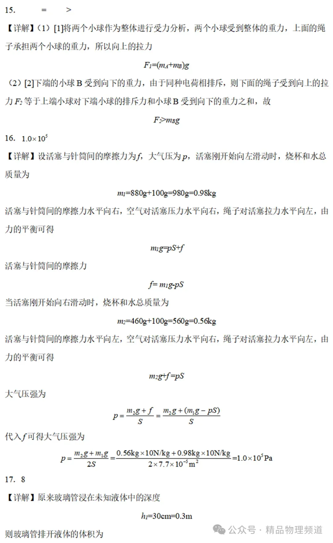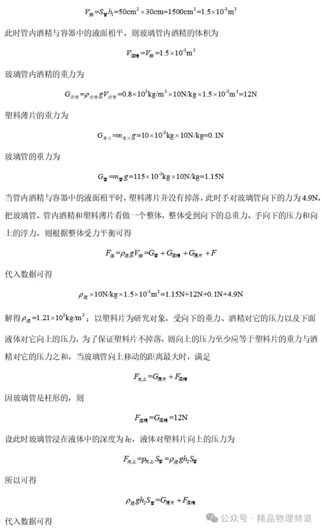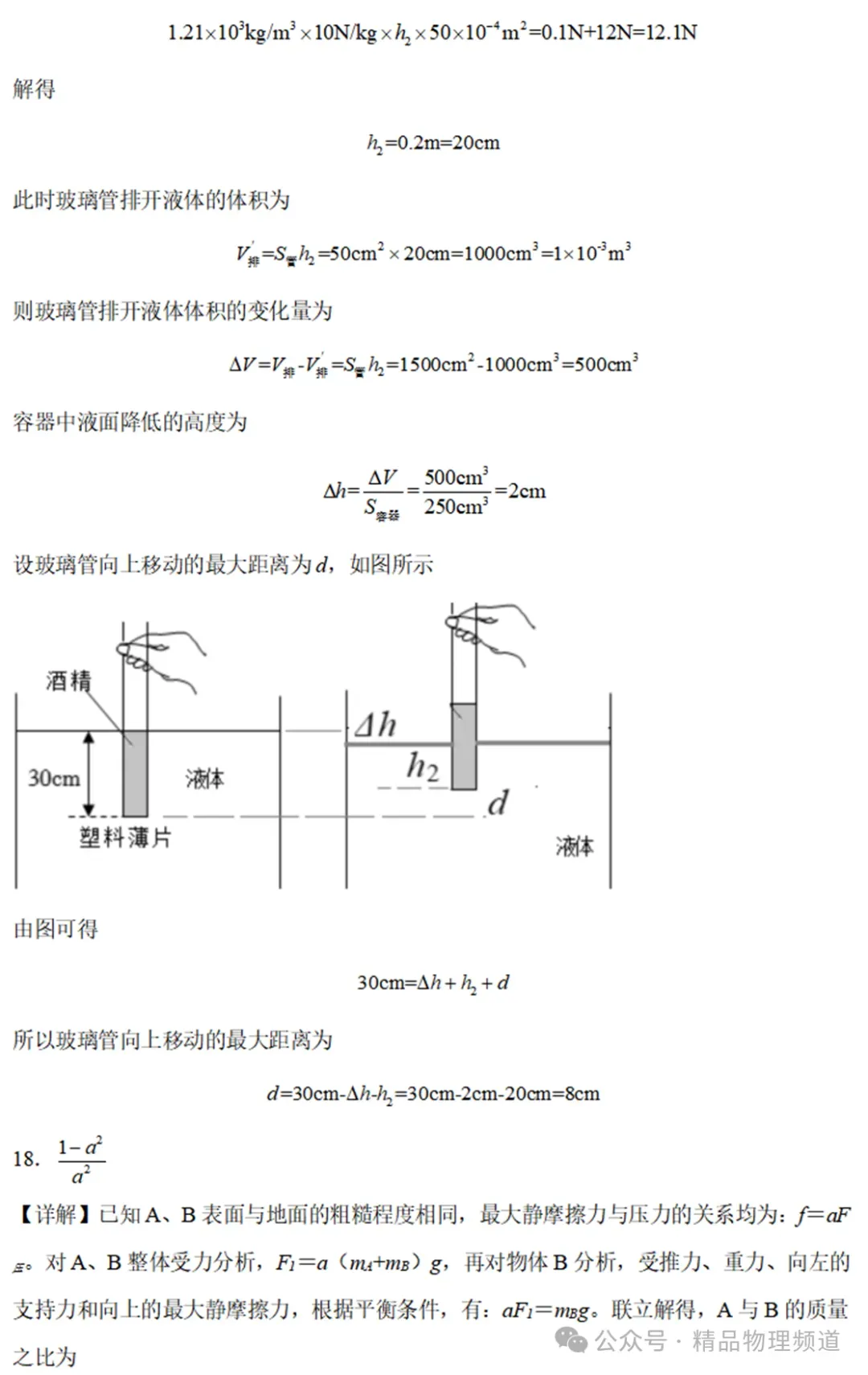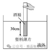 17.一柱形容器底面积250cm2,两端开口的薄壁玻璃管(厚度不计)质量115g,横截面积50cm2,在其下端紧贴一质量10g、面积100cm2的塑料薄片(薄片厚度不计,且与玻璃管不粘连),浸入到未知液体内30cm深处,然后沿管壁慢慢注入酒精(ρ=0.8g/cm3),当管内酒精与容器中的未知液体面相平时,塑料薄片并没有掉落,此时手对玻璃管向下的力为4.9N,为了保证塑料片不掉落,玻璃管向上移动的最大距离为cm。(未知液体对塑料薄片的阻力不计)