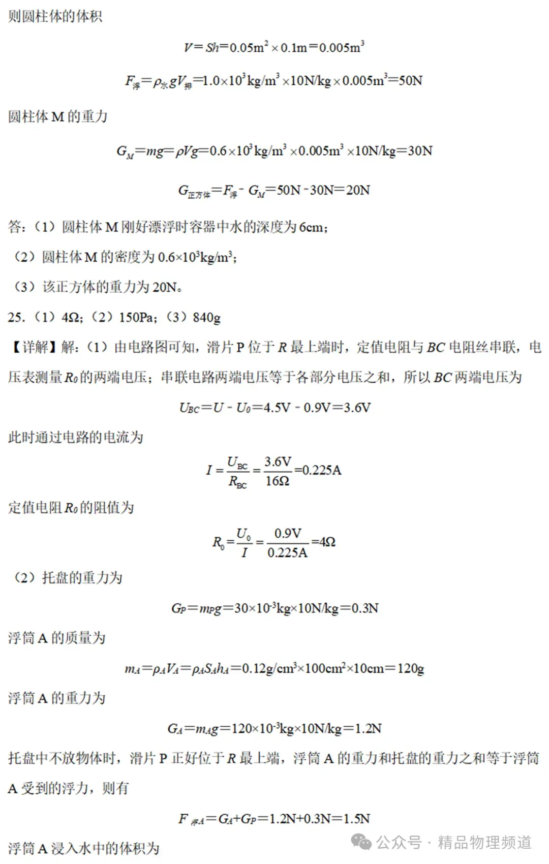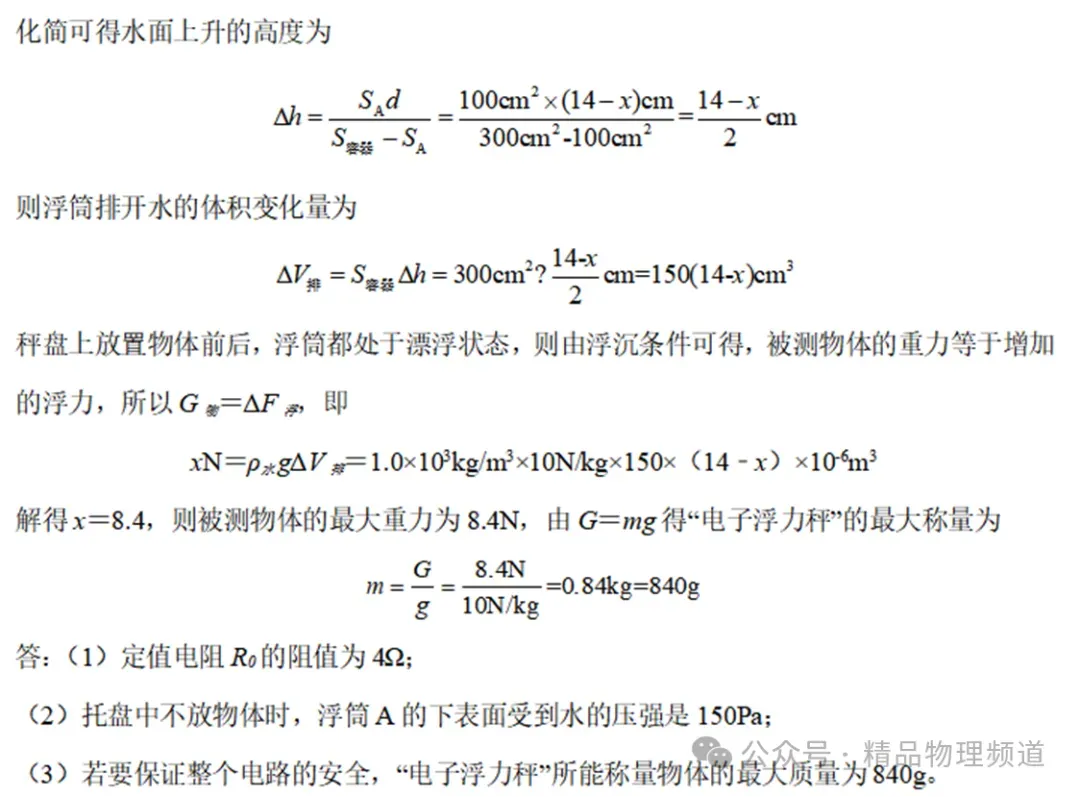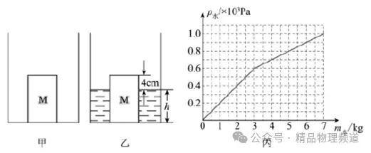 (1)杠杆机械效率的表达式为η=。(用已知或测量的物理量符号表示)(2)本次实验中,若提升的钩码重一定,则影响杠杆机械效率的主要因素是:。(3)若只将钩码的悬挂点由A移至C,O、B位置不变,仍将钩码提升相同的高度,则杠杆的机械效率将(选填“变大”、“变小”或“不变),24.一个圆柱形容器放在水平桌面上,如图甲所示,容器中立放着一个底面积为500cm2的均匀实心圆柱体M,现慢慢向容器中加水,加入的水对容器底的压强P水与所加水的质量m水的关系如图丙所示,容器足够高,在整个过程中无水溢出,M的底面始终与容器中的水面平行。当加入的水等于3kg时,物体M刚好漂浮且露出水面的高度为4cm,如图乙所示(己知ρ水=1.0×103kg/m3)。求:(3)当容器中加入足够多的水后,把一正方体放在圆柱体M上,圆柱体刚好浸没,则该正方体的重力为多少?25.如图所示是某物理兴趣小组设计的电子浮力秤的原理图。托盘质量30g,与质量不计的滑片P相连,并一起上下自由滑动(滑动过程中的摩擦力忽略不计,托盘底部始终保持水平,且托盘、弹簧不与电路连通)。圆柱形浮筒A底面积为100cm2,高为10cm,密度为0.12g/cm3,漂浮在底面积为300cm2,装有足够深的水的容器中。托盘与浮筒A用质量不计的轻质弹簧相连,且控制弹簧只能在竖直方向上形变,弹簧的形变量与受到的外力成正比,受到1N的外力时形变量为1cm。BC是一根长为16cm的阻值均匀的电阻丝,最大阻值为16Ω,电源电压恒为4.5V,电压表量程为0~3V。当托盘中不放物体时,闭合开关S,调节容器中水量,使滑片P正好位于R最上端,读出电压表示数为0.9V。求:(2)托盘中不放物体时,浮筒A的下表面受到水的压强是多大?(3)若要保证整个电路的安全,“电子浮力秤”所能称量物体的最大质量为多少g?