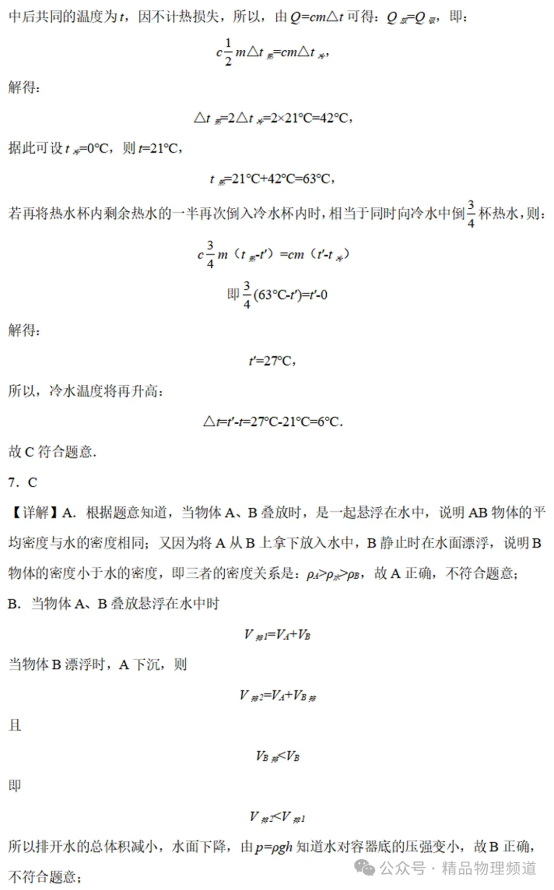 4.科学研究表明,无论采用什么方法降温,温度也只能非常接近-273.15°C,不可能达到。若把-273.15°C定义为0“开”,上升1“开”与上升1℃是相同的,则用这种新方法表示的“200开”是( )5.做匀速直线运动的甲乙两人,分别从大桥的东西两端同时出发,相向而行,两人首次相遇处距大桥东端300m,相遇后,两人仍以原来的速度继续前进,走到对方桥头又立即返回,返回后运动的速度大小不变,他们再次相遇处距大桥东端100m,根据计算可得到甲乙两人的速度之比是( )6.在两个相同的杯子内盛有质量相等的热水和冷水,将一半热水倒入冷水杯内,冷水杯内的温度升高21℃,若再将热水杯内剩余热水的一半再次倒入冷水杯内,冷水杯内的水温会升高( )7.容器内装有一定质量的水,将物体A、B叠放后一起放入水中,静止时如图所示。再A将从B上拿下放入水中,B静止时在水面漂浮。下列说法错误是( )B.物体B漂浮后,水对容器底的压强变小