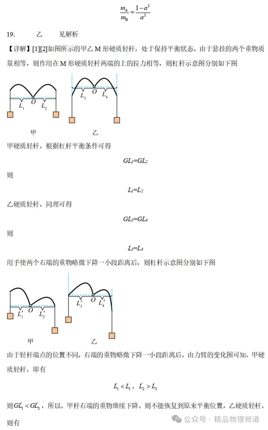 19.如图所示的甲、乙两个M形硬质轻杆可绕中间转轴O灵活转动,杆两端分别用细绳悬挂两个质量相等的重物,现保持平衡状态,用手使两个右端的重物略微下降一小段距离后再松手,能恢复到原来平衡位置的是,理由是。20.如图所示,其中电流表有一定内阻,量程为0.6A,表盘均匀划分为30个小格,每小格表示0.02A;R1的阻值等于电流表内阻的1/2;R2的阻值等于电流表内阻的2倍,若用电流表表盘刻度表示流过接线柱1的电流值,则将接线柱1、2接入电路时,每一小格表示A;将接线柱1、3接入电路时,每一小格表示A。21.物理学告诉我们,对每个星球来讲,下列公式成立:R2g=KM,这一关系式被称为“黄金变换”。其中:R为星球的半径,g为星球的引力常数(我们学过,g=10N/kg),M为星球的质量,K=6.67×10-11N·m2/kg。(1)火星的半径是地球的一半,密度是地球的8/9,请你推导:卡特站立在火星上对火星表面的压强与站立在地球上对地面的压强之比是,球体体积公式:V球=4πR3/3;(2)若不计空气阻力,人们跳远的最远距离s与星球的g成反比,与起跳速度v0的关系如图像所示。下列四个关于s的表达式中只有一个是正确的,应该选择;