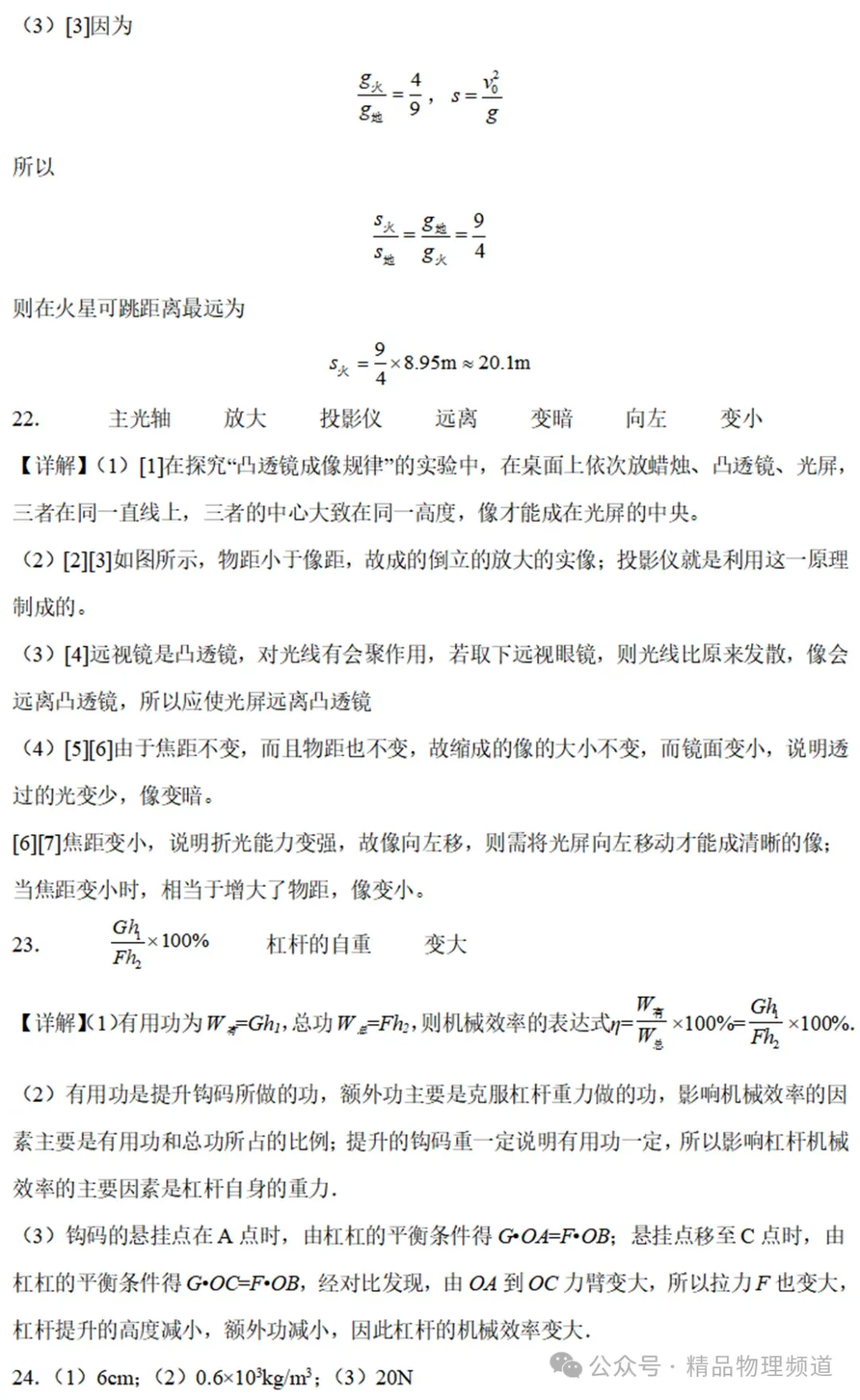(3)不计空气阻力,如果卡特在地球上最远可以跳8.95m(世界跳远纪录),则他在火星上以相同的速度起跳,最远可以跳m。(保留到小数点后一位)(1)实验前,应调整烛焰和光屏的中心位于凸透镜的上;(2)图中光屏上所成的像是倒立(选填“放大”、“等大”或“缩小”)的实像,生活中(选填“照相机“投影仪”或“放大镜”)利用这一原理制成;(3)完成实验后,继续模拟远视眼的缺陷:给透镜戴上远视眼镜,调节光屏的位置,使烛焰在光屏上成一个清晰的像:取下远视眼镜,保持蜡烛和凸透镜的位置不变,为使光屏上再次得到清晰的像,应将光屏(选填“远离”或靠近”)透镜;(4)当光屏上呈现清晰的像时,不改变图中蜡烛和透镜位置;①若将凸透镜换成焦距相同但镜面较小的凸透镜,再次做实验,光屏上所成的像与原来相比(选填“变小”、“变暗”或“变不完整”)了;②若将凸透镜换成镜面大小相同焦距稍小的凸透镜,再次实验,则需将光屏(选填“向左或“向右)移动才能成清晰的像,光屏上所成的像与原来的像相比(选填“变大不变或“变小”)。23.某实验小组利用图示装置研究杠杆的机械效率,实验的主要步骤如下:①用轻绳悬挂杠杆一端的D点作为支点,在A点用轻绳悬挂总重为G的钩码,在B点用轻绳竖直悬挂一个弹簧测力计,使杠杆保持水平;
