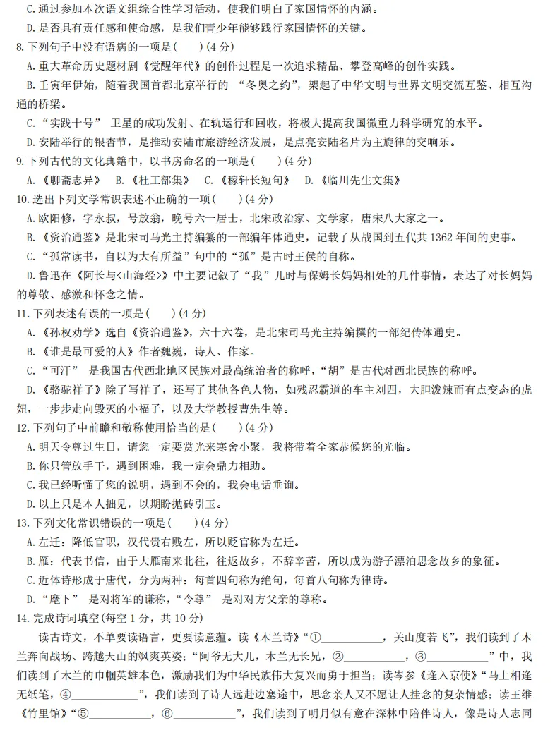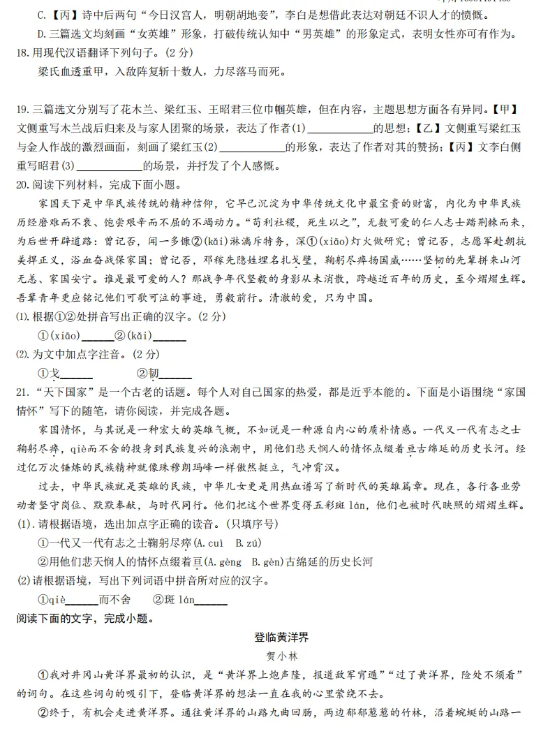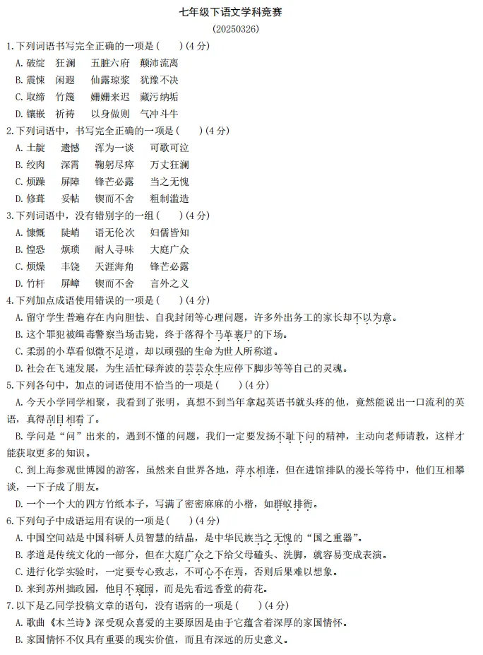 七年级下学期的月考时间,一般是在开学后一个月,考查范围是1-2/3单元,看各校进度,一般讲过的就是范围。按往年情况,比较重视基础部分考查,有的学校不考作文,所以基础的字词、诗词、病句等题型,要特别重视。下面是去年23中的月考卷和答案,各位可以参考。1-13.CDBBBDBCAADDD