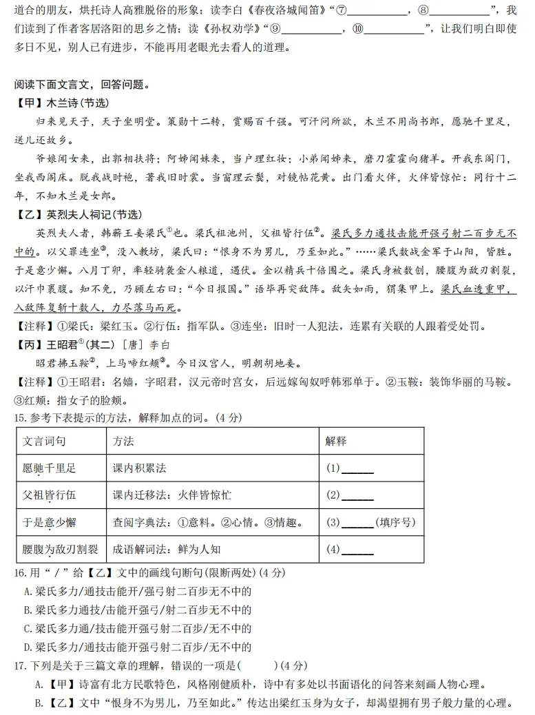 14.万里赴戎机愿为市鞍马从此替爷征凭君传语报平安深林人不知明月来相照此夜曲中闻折柳何人不起故园情士别三日即更刮目相待