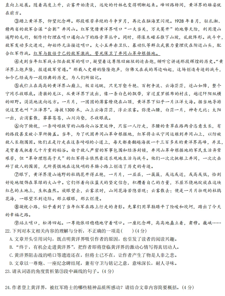 24.①红军想尽一切办法创造与敌人抗击的武器,体现了红军不畏艰难、勇往直前的精神。② 群众武装力量和红军相互配合,誓死保卫井冈山根据地,体现了红军视死如归、为了革命胜利的大无畏精神。③红军在艰难的环境下仍能完成运粮任务并且创造了奇迹,体现红军吃苦耐劳、不怕苦、不怕累、乐观的革命精神。