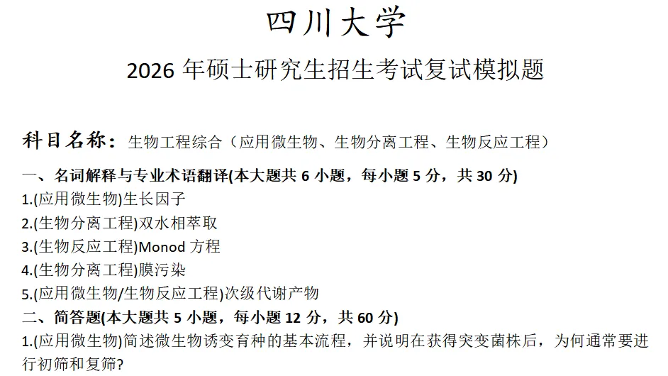 四川大学生物工程综合考研复试真题模拟