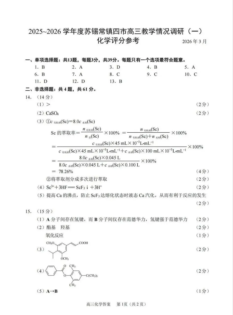 >江苏省2026年苏锡常镇一模化学试卷和参考答案