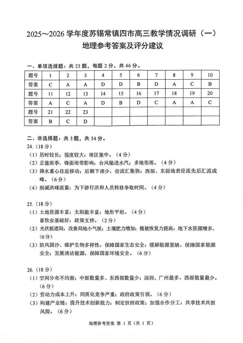>江苏省2026年苏锡常镇一模地理试卷和参考答案